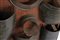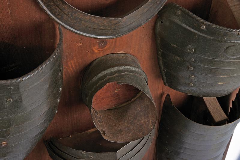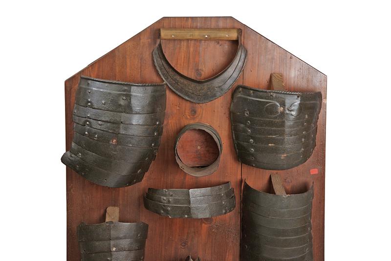Lotto di parti d'armatura, datazione: Fine del XVI Secolo provenienza: Italia, Parte di una goletta, parti di spallacci e scarselle, un cannone di braccio e due cubitiere. La superficie in patina bruna. Probabilmente provenienti da suite diverse. Alcuni bordi con cordoni lavorati a fingere il tortiglione. Ribattini in ferro. Montate su un pannello ligneo espositivo. altezza total 100 cm.