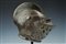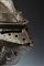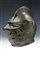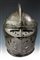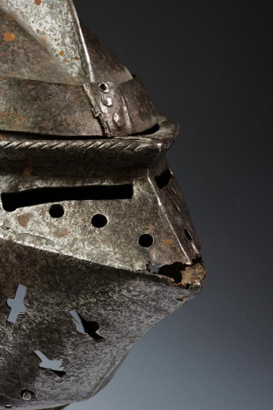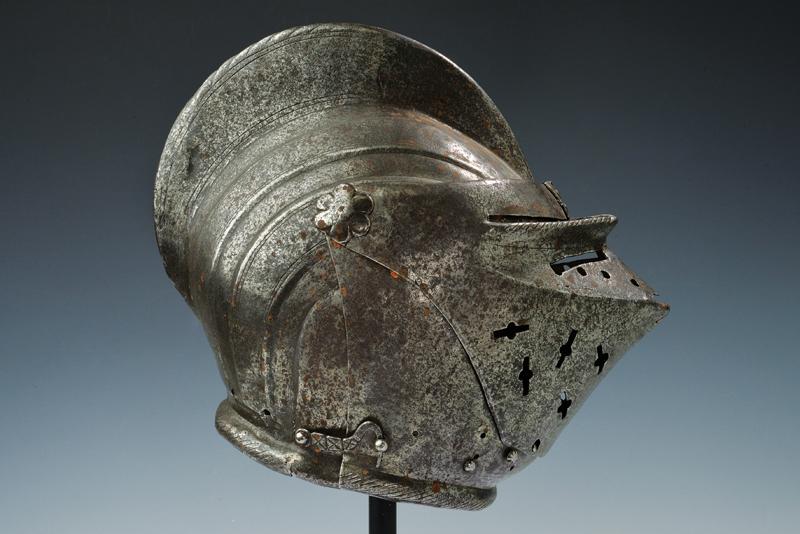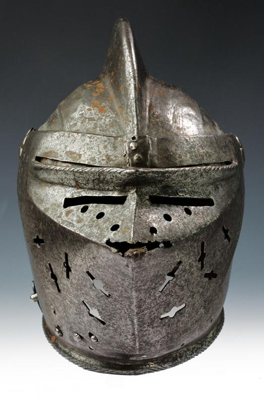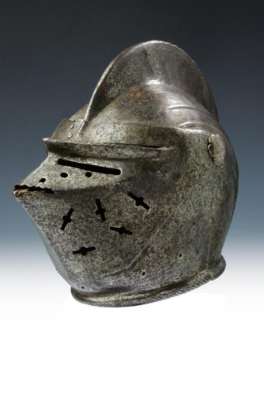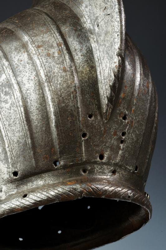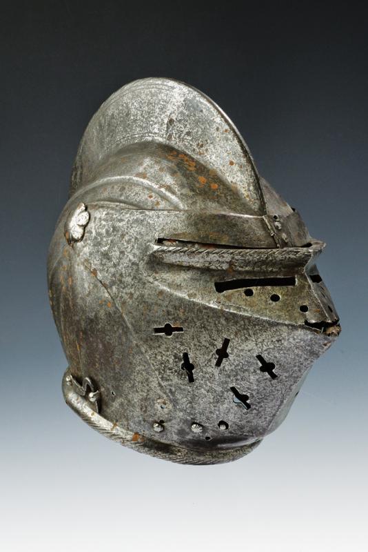 Elmo chiuso composito, datazione: 1600 circa provenienza: Germania, Coppo in un solo pezzo con cresta media alta lavorato a fingere il tortiglione, i lati con due bande sbalzate e resti di doppie linee, vecchi restauri; ventaglio di ricambio costolato in mezzeria, con fessure oculari e trafori a chiave da aerazione. Piccole mancanze e restauri. Il bordo della barbozza lavorato en suite con quello della coppo. Gancio e bottone per il fissaggio. altezza 24.5 cm.