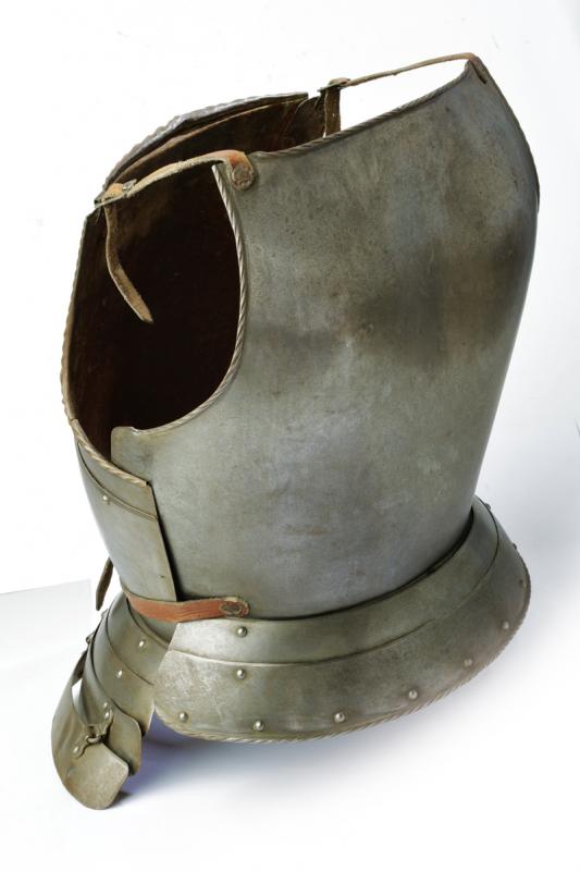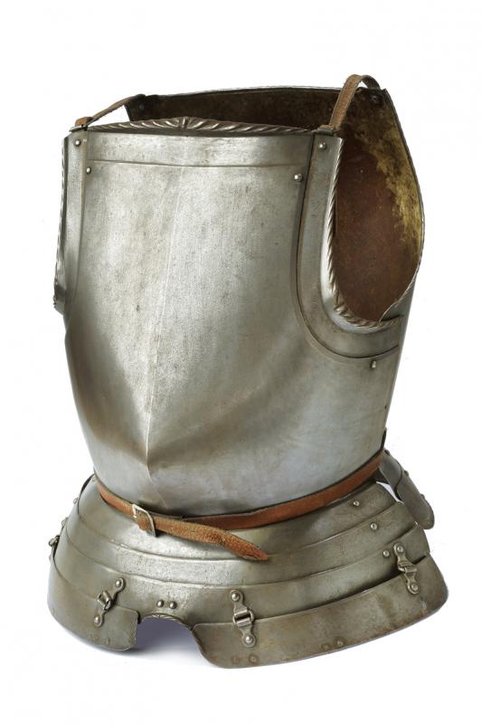 Petto e schiena, datazione: Seconda metà del XVI secolo provenienza: Germania, Il petto costolato in mezzeria e con tapul accentuato, lo scollo di taglio quasi dritto con spesso cordone lavorato a fingere il tortiglione. Munito di falda a tre lame. La schiena con due lame di falda. altezza 54 cm.