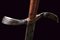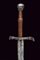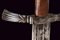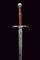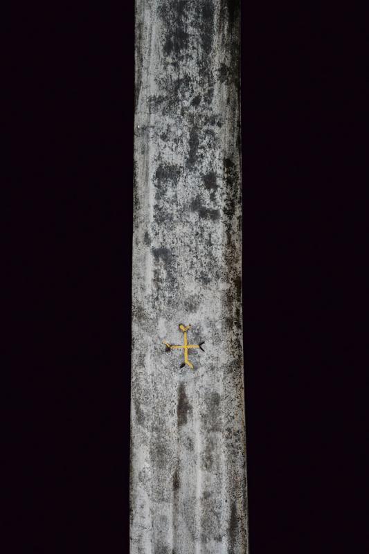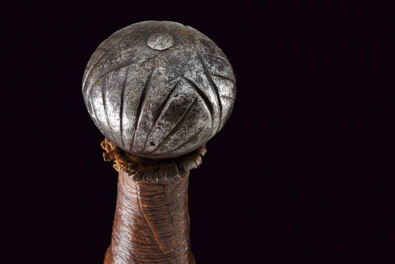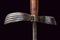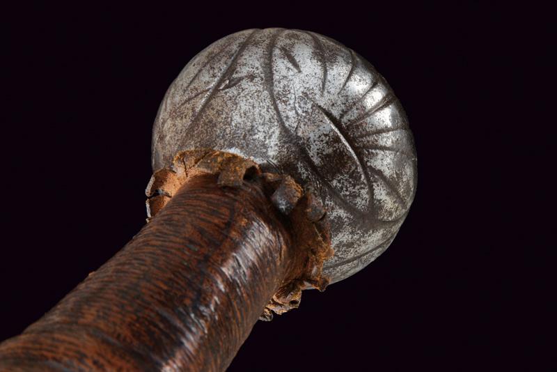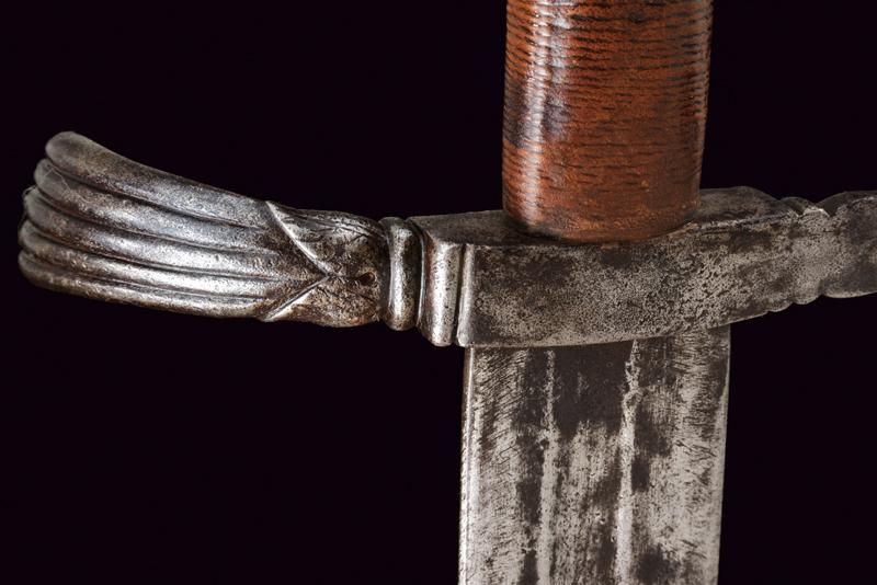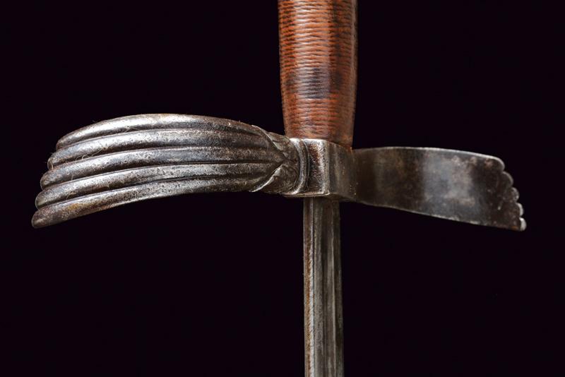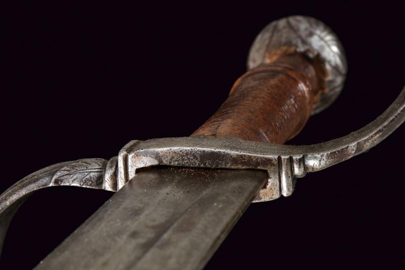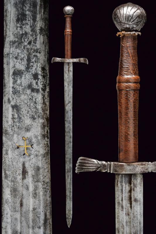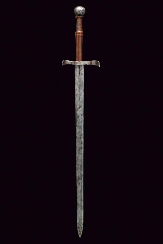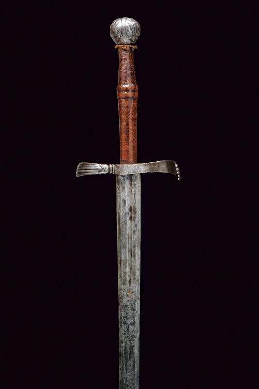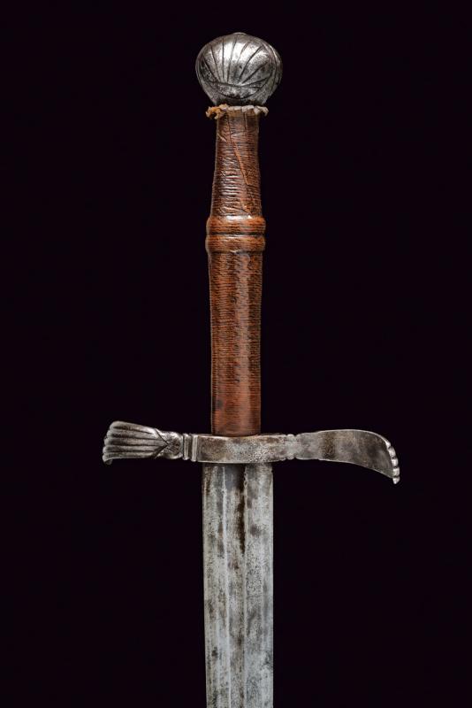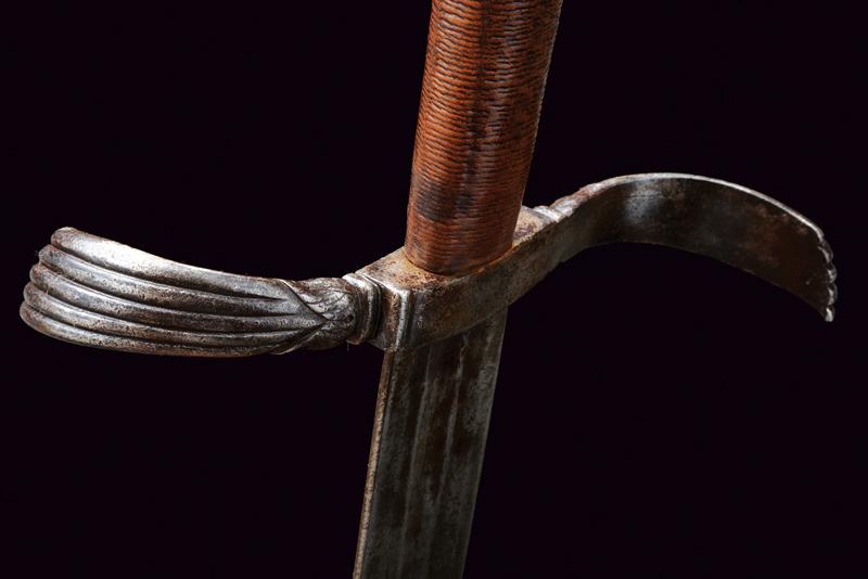 Spada a una mano e mezza, datazione: primo quarto del XVI Sec. provenienza: Veneto, Larga lama dritta, la prima parte sgusciata al centro e con taglio tondo, alla fine della sgusciatura una croce rimessa in ottone, da qui un delicato sguscio e a due fili. Bell'elso in ferro a 'S', a bracci piatti intagliati con scanalature sul lato esterno crescente da un bocciolo alla base; grande pomo intagliato a conchiglie. Impugnatura a una mano e mezza in legno ricoperto di cuoio (di restauro). Interessante e rara tipologia. lunghezza 112.5 cm.