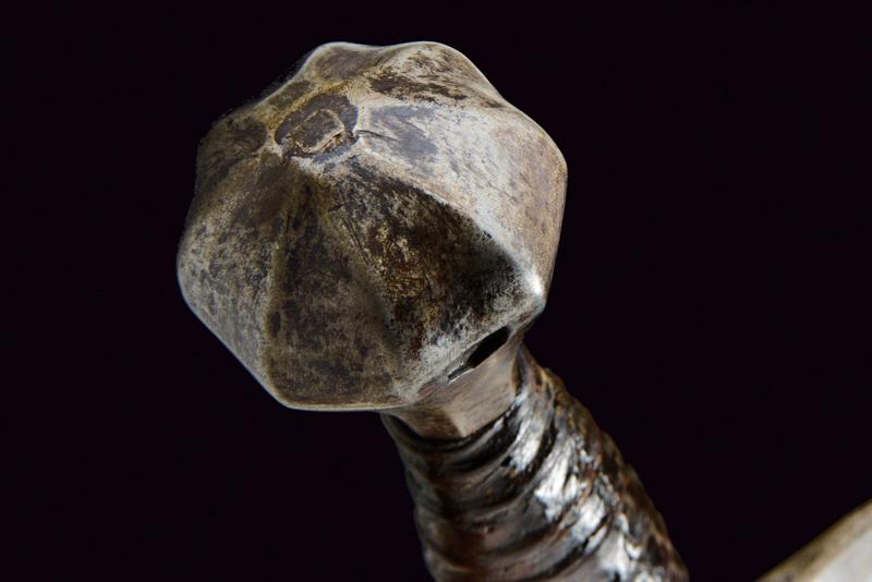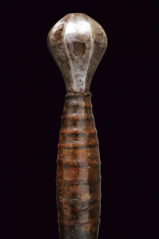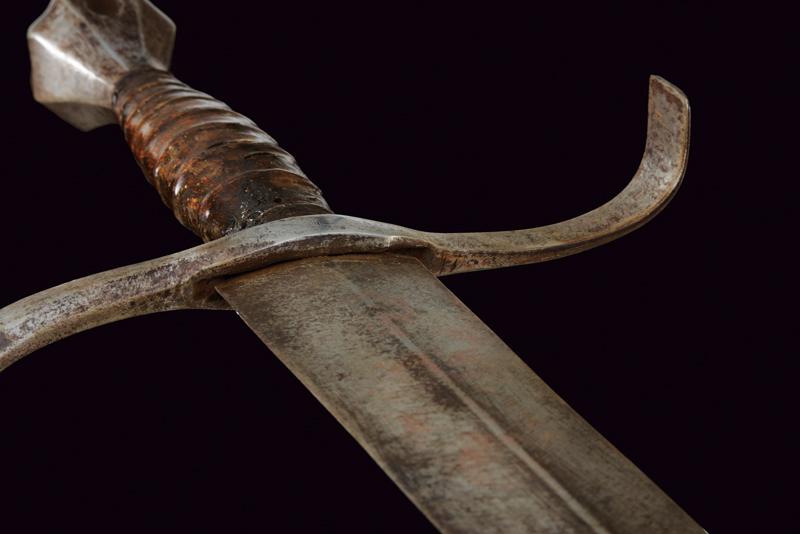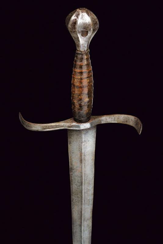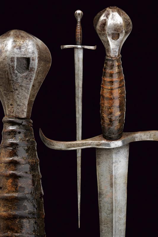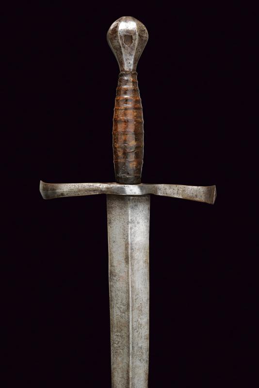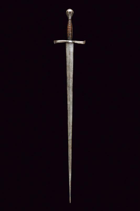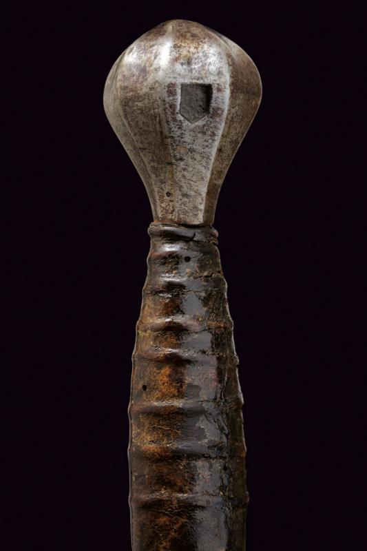 Stocco composito, datazione: XVI Sec. provenienza: Italia settentrionale, Lunga lama di forma triangolare, a due fili di sezione a losanga; elso in ferro a 'S' costolata nella parte esterna. Grande pomo a pera faccettata con due punzoni a scudetto. Impugnatura in legno rivestito di cuoio. lunghezza 148 cm.