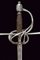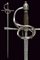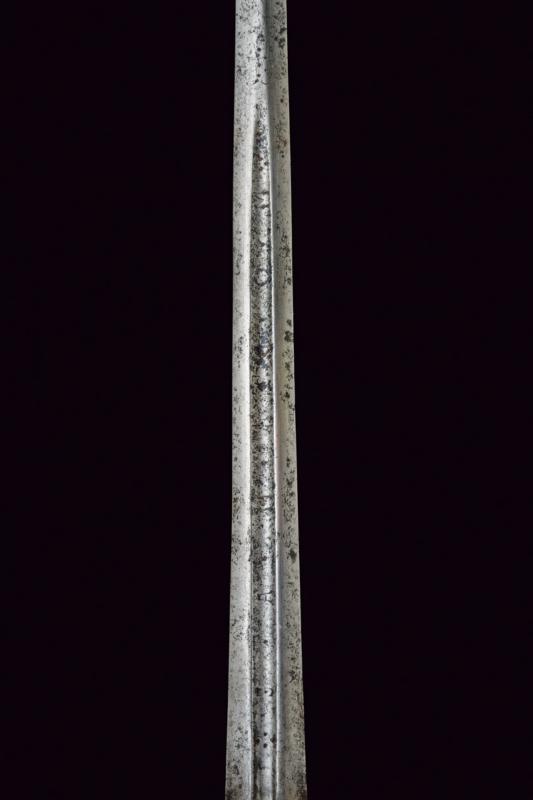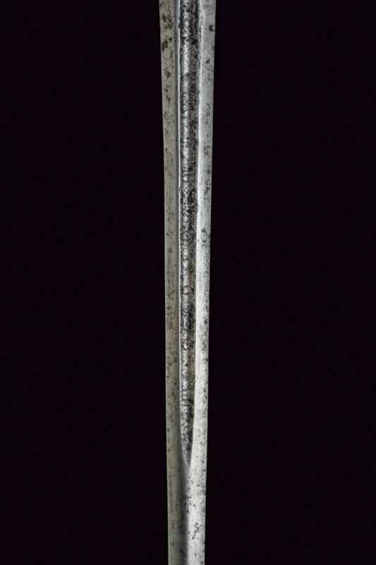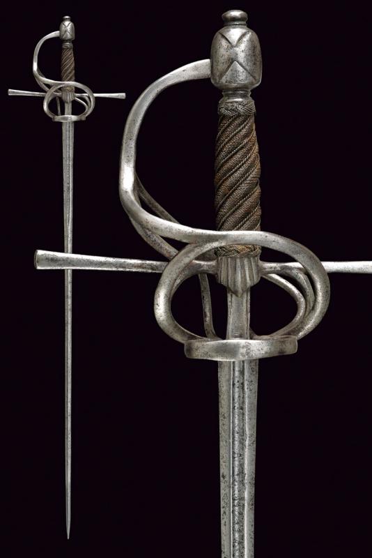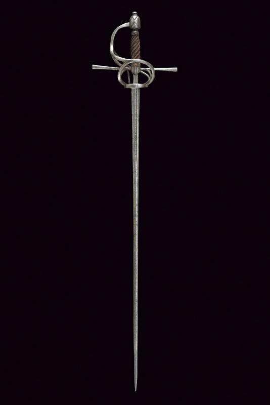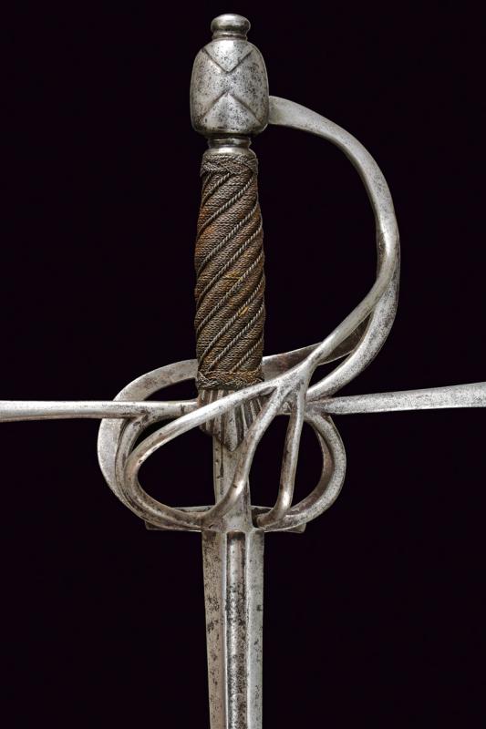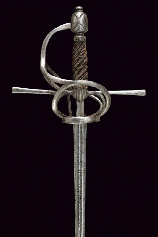 Spada da lato, datazione: primo quarto del XVII Sec. provenienza: Germania, Lama dritta di sezione a losanga, la prima parte scanalata in mezzeria e con resti di iscrizioni, ricasso delineato ai bordi. Fornimento in ferro con massello scanalato e pomo intagliato. Impugnatura in legno rivestito di trecciola e teste di moro in filo di ferro. lunghezza 98.8 cm.
