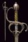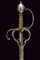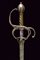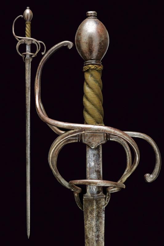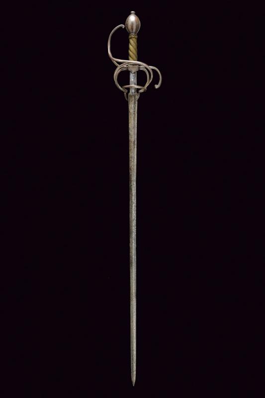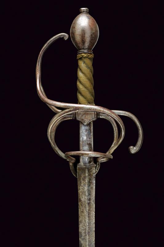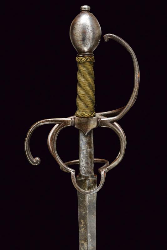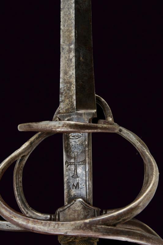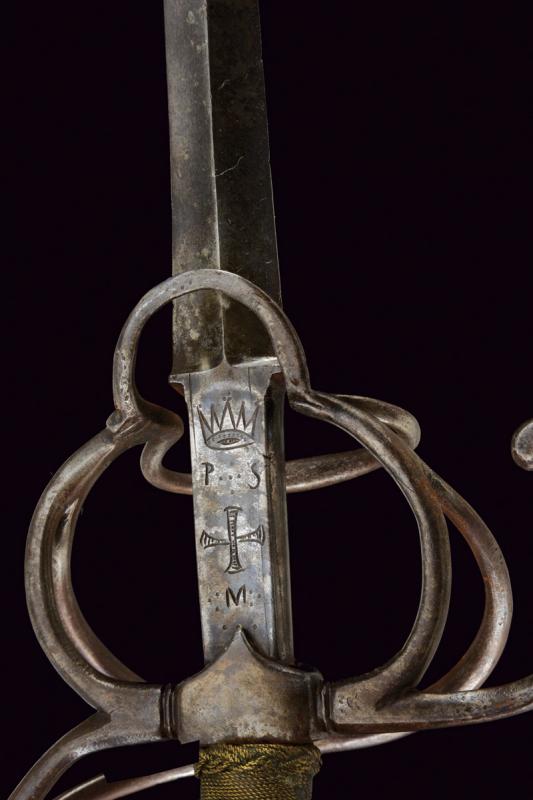 Spada da lato, datazione: inizio del XVII Sec. provenienza: Italia, Lama dritta a due fili di sezione a losanga, ricasso rettangolare, leggermente concavo e marcata con corona, croce e 'M' su entrambi i lati. Fornimento in ferro con sottoponte, grande pomo a oliva ed impugnatura in legno rivestita di trecciola e teste di moro in filo d'ottone. lunghezza 109 cm.