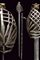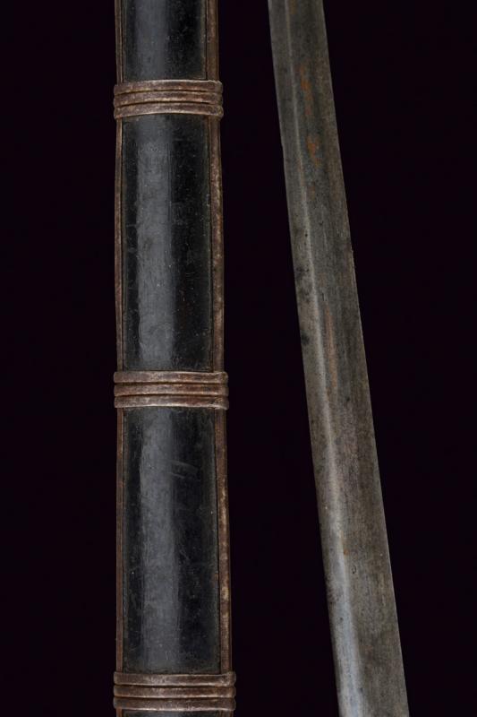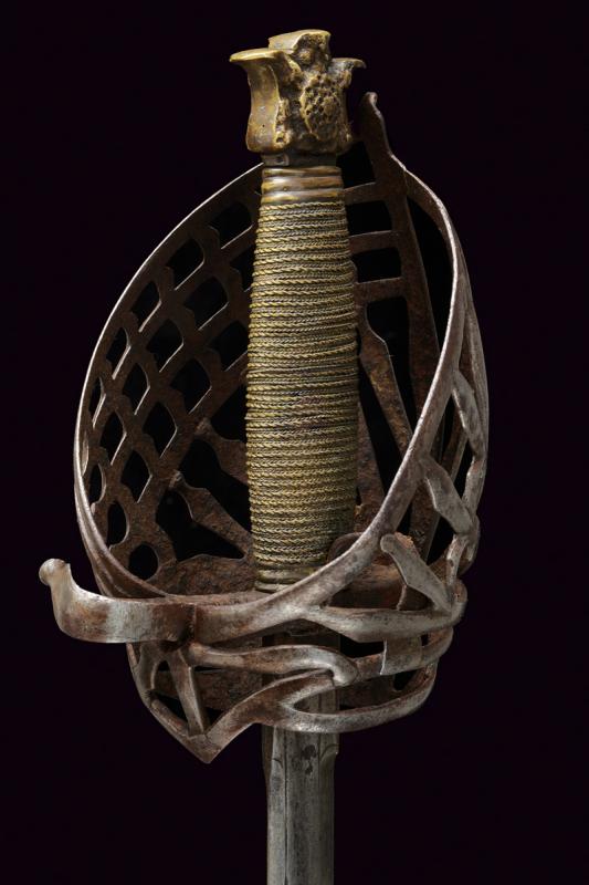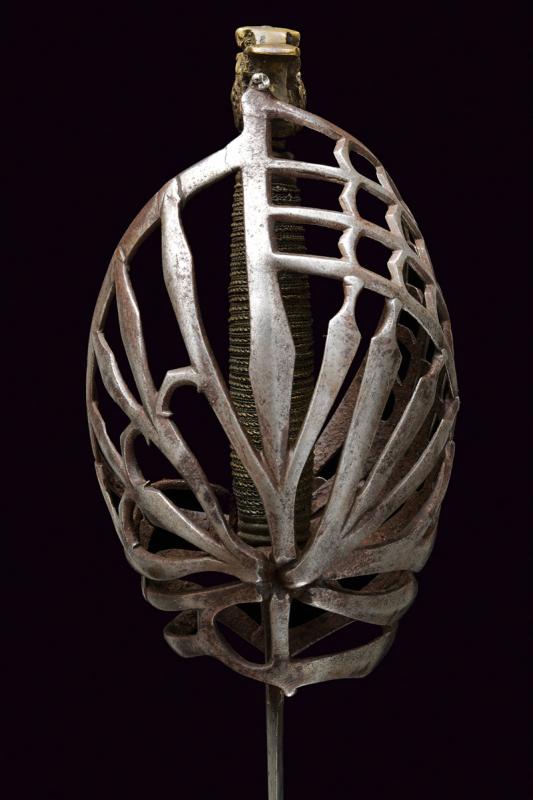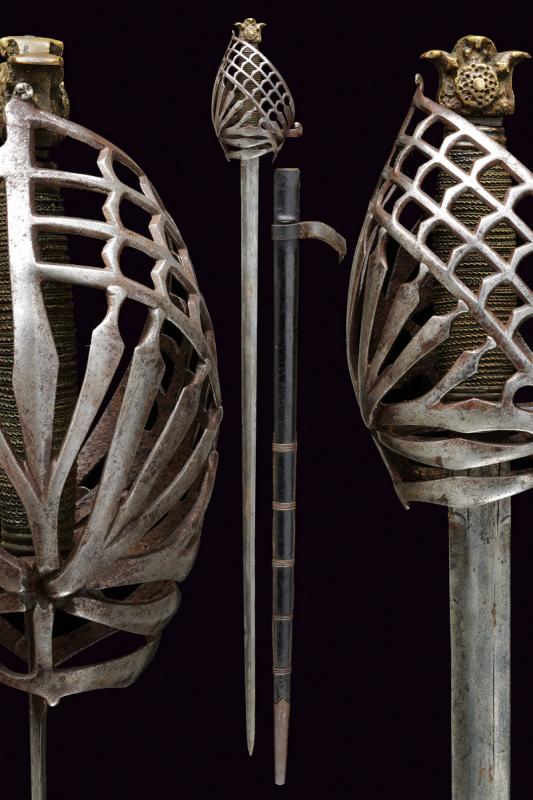 Schiavona con fodero, datazione: XVIII Secolo provenienza: Veneto, Lama dritta a due fili di sezione esagonale; tallone leggermente sgusciato e delineato ai bordi; tipico fornimento a gabbia in ferro con poggiadito e pomo in ottone a testa di gatto stilizzato, impugnatura in legno rivestito di trecciola metallica. Fodero in legno ricoperto di cuoio con fornimenti in ferro e attacco con fibbia. Rara. lunghezza 113 cm.