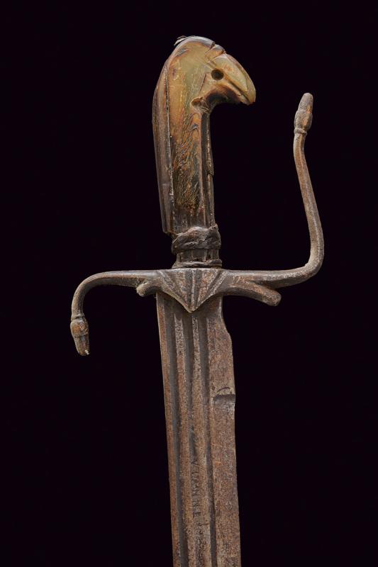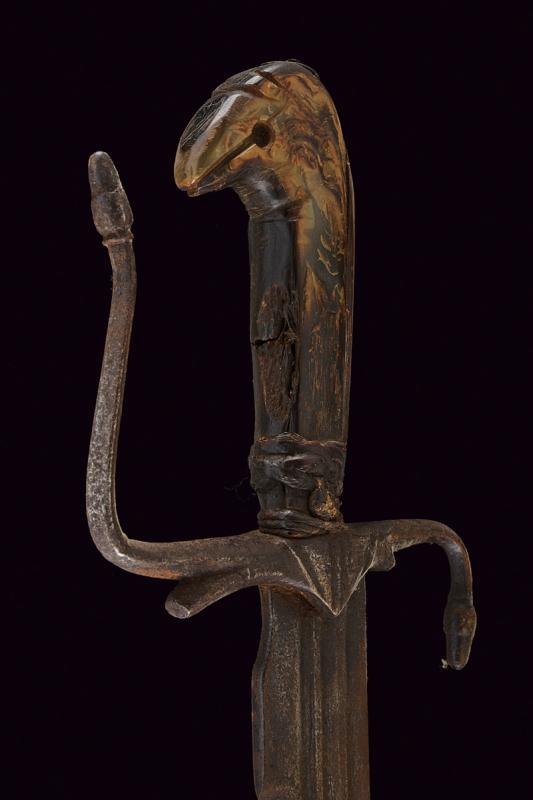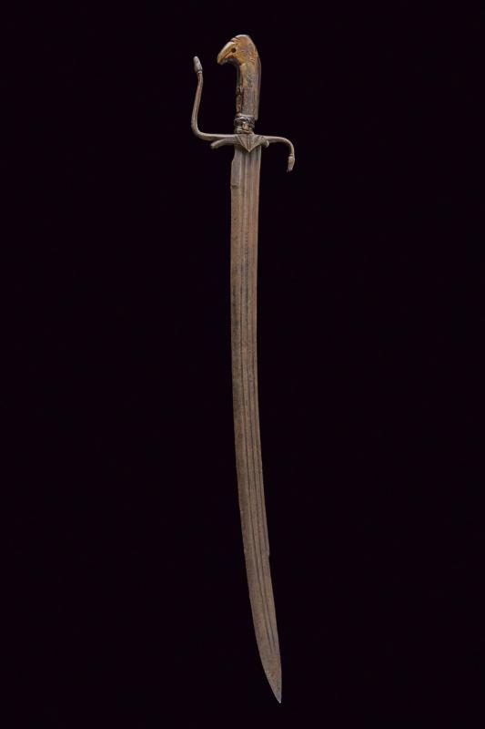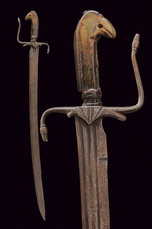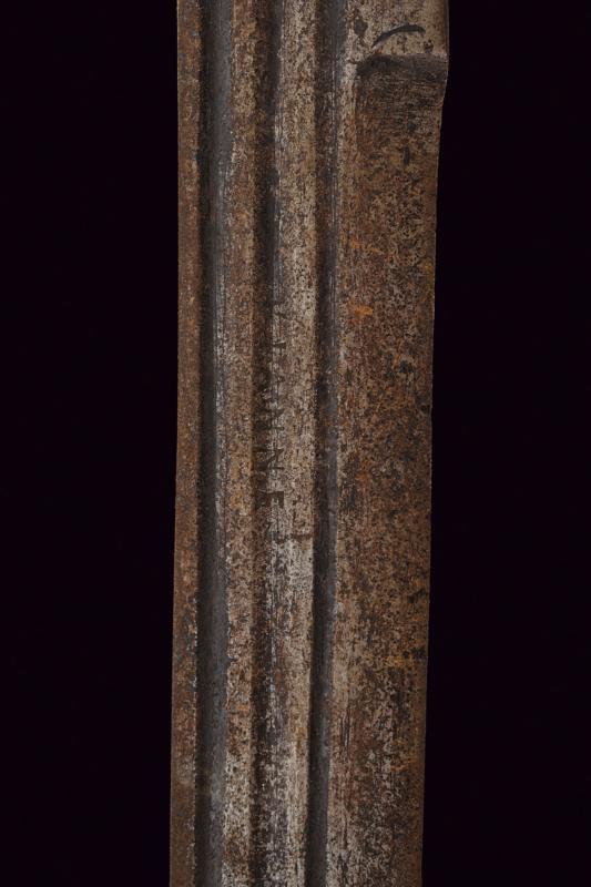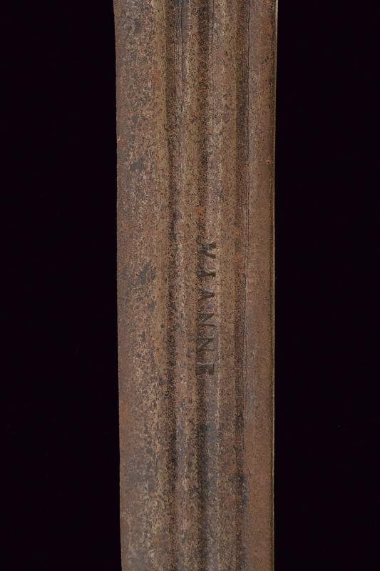 Interessante storta, datazione: 1700 circa provenienza: Italia, Lama curva, a un filo e controfilo, con triplice scanalatura, marcata 'VIANNE', il tallone con incavatura per il dito. Fornimento in ferro con massello triangolare, braccio dell'elso e ramo di guardia terminanti in una ghianda, il secondo braccio incompleto. Impugnatura in corno (piccole mancanze e difetti) con pomo a becco stilizzato, la base rivestito con resti di bande in cuoio. lunghezza 81 cm.