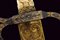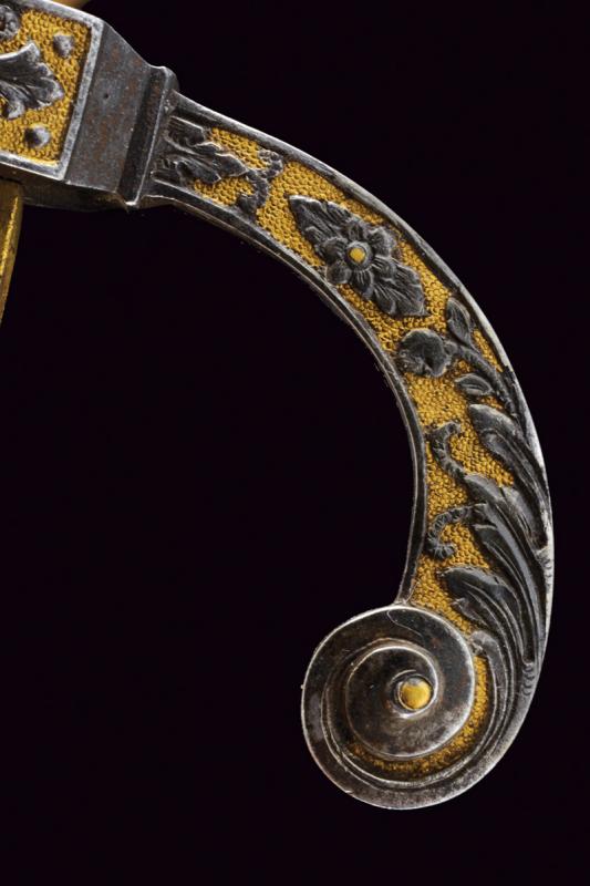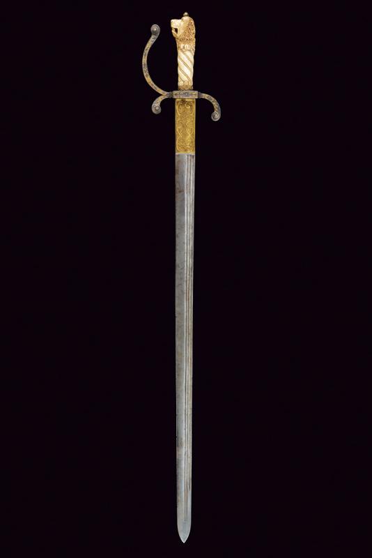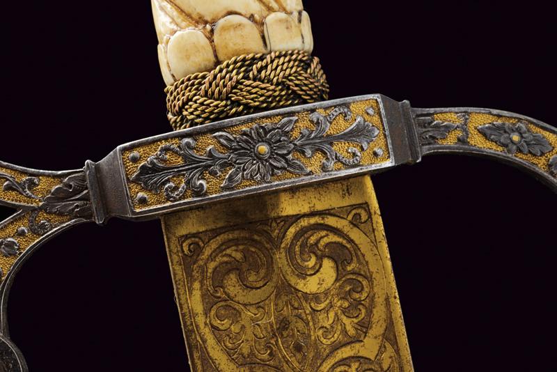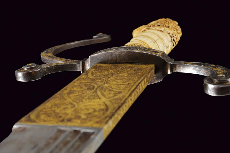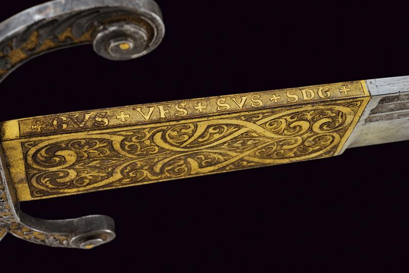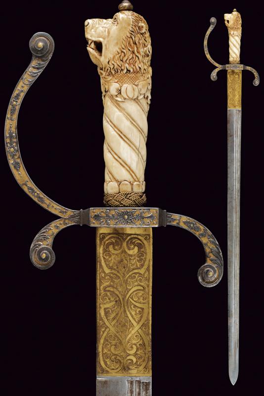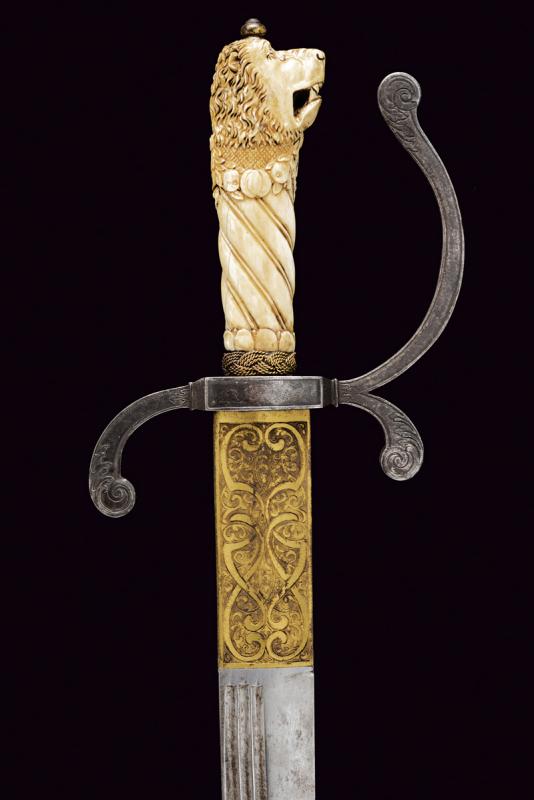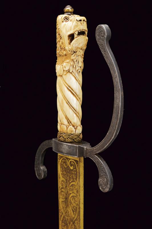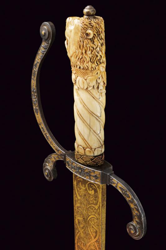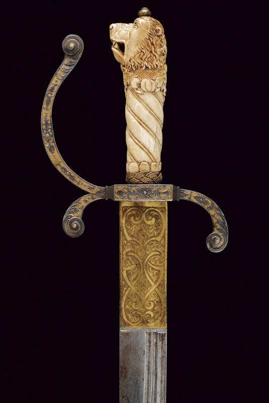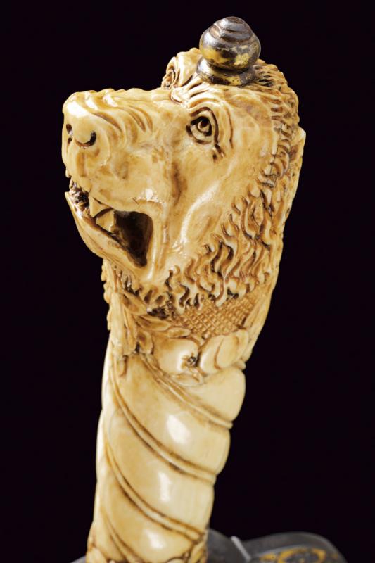 Interessante spada da caccia, datazione: 1600 - 1610 provenienza: Francia, Lama dritta di media larghezza, a un filo e breve controfilo con triplice scanalatura vicino al dorso. Lungo tallone finemente inciso e dorato a motivi floreali su entrambi i lati, il dorso con iscrizione 'GVS VFS SVS SDG' sempre diviso da una croce. Fornimento in ferro con elso rettangolare, leggermente convesso, con corti bracci e ramo di guardia, tutti intagliati in bassorilievo su fondo granulato e dorato a motivi floreali sul lato terzo, la parte posteriore incisa. Bellissima impugnatura in avorio finemente scolpito con una testa di leone al pomo e a spire nella parte dell'impugnatura. Ghiera a modo di teste di moro in filo di metallo. Bottone in ferro dorato. Rara e bella spada. lunghezza 101.5 cm.