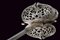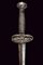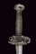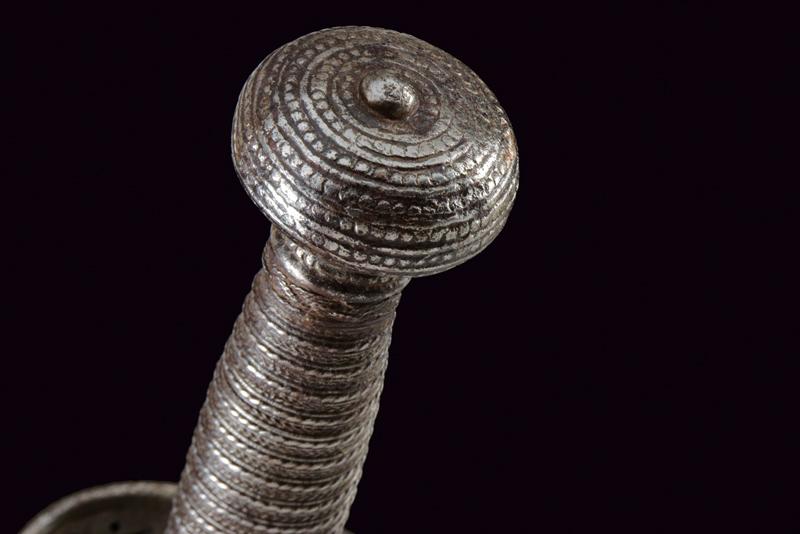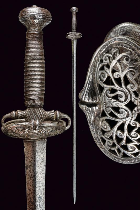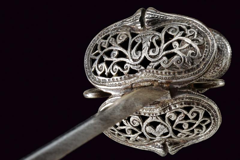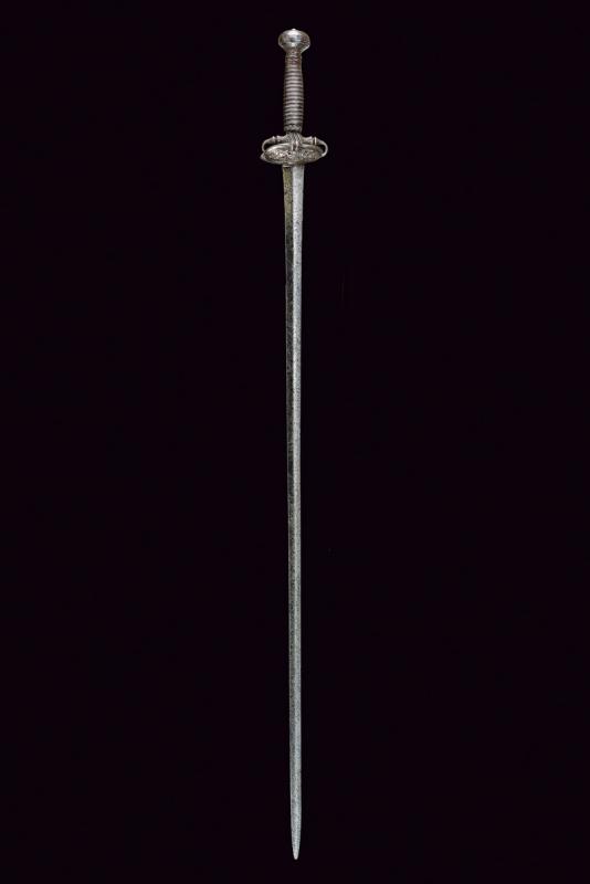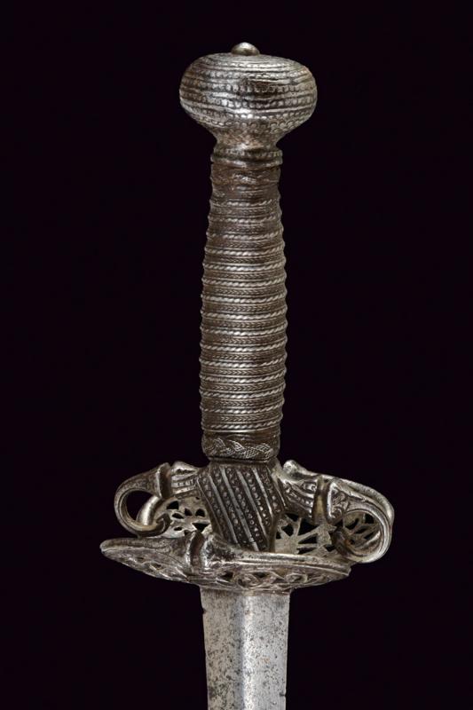 Spadino composito, datazione: XVIII Secolo provenienza: Germania, Lama dritta di sezione a losanga; fornimento in ferro con doppia valva riccamente traforata a motivi floreali, una con cuore al centro, l'altra con una lira stilizzata. Massello decorato a linee perlinate oblique e con due bracci corti incurvati verso il centro. Pomo a fungo con decorazioni simili al massello (probabilmente più antica). Impugnatura in legno rivestito di trecciola e teste di moro in filo di ferro. lunghezza 114.5 cm.