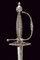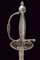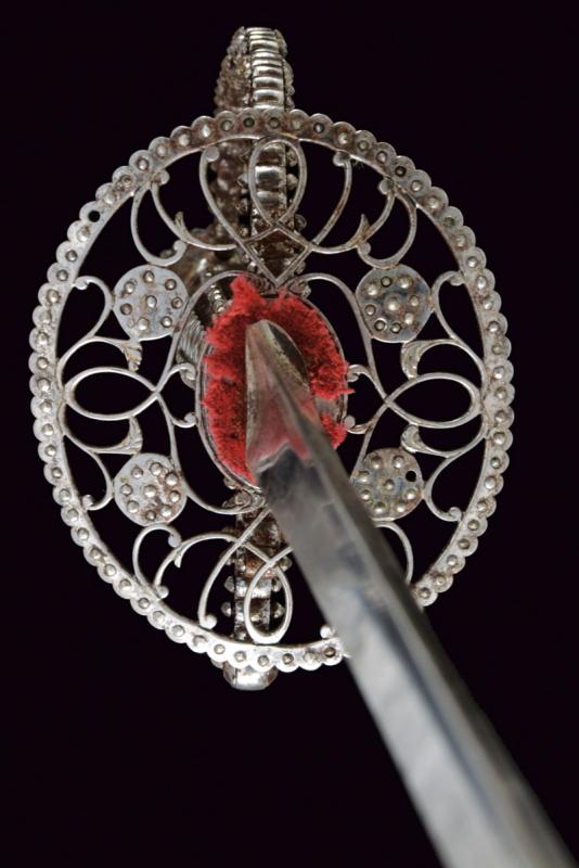 Elegante spadino, datazione: 1800 circa provenienza: Francia, Lama di sezione triangolare con breve tallone. Fornimento massiccio in ferro riccamente decorato con perline in acciaio, la valva traforata con sottili piccoli riccioli, fra di loro rosette. Completo di fodero in legno rivestito di cuoio con fornimenti in ferro e catenina non pertinente in ottone. lunghezza 106 cm.