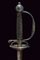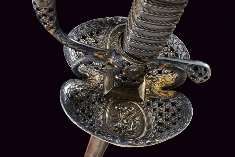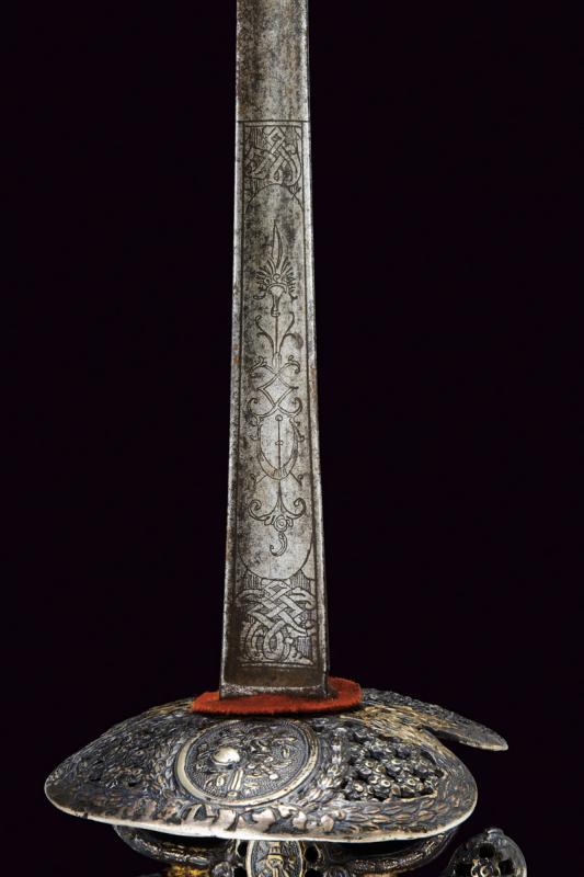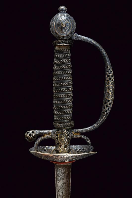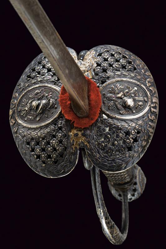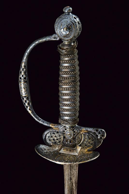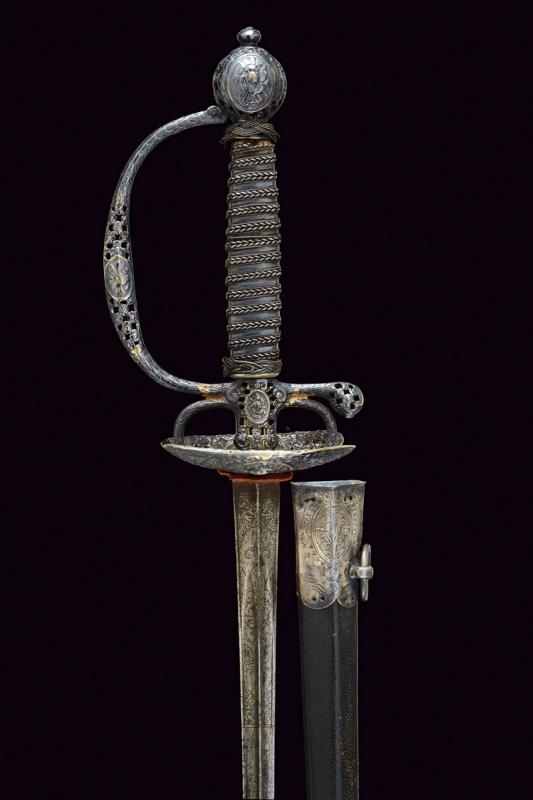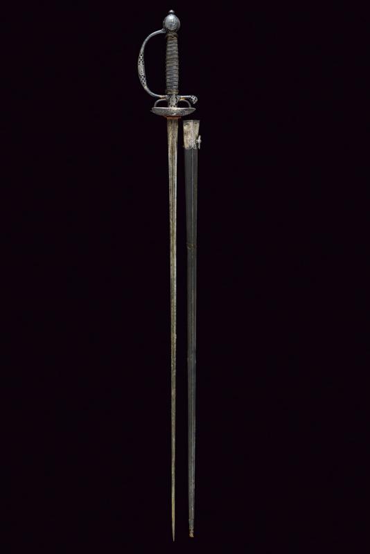 Bellissimo spadino con fornimento in argento, datazione: ultimo quarto del XVIII Sec. provenienza: Francia, Lama dritta di sezione triangolare con facce incavate, la prima parte a motivi floreali e geometrici. Fornimento in argento riccamente inciso e traforato a trofei e motivi floreali. Impugnatura in legno rivestito di trecciola e teste di moro (quello superiore danneggiato) in argento. Fodero in cuoio con cappa in argento inciso munito di un anello di sospensione. Puntale mancante. In bella patina scura. lunghezza 98.5 cm.