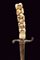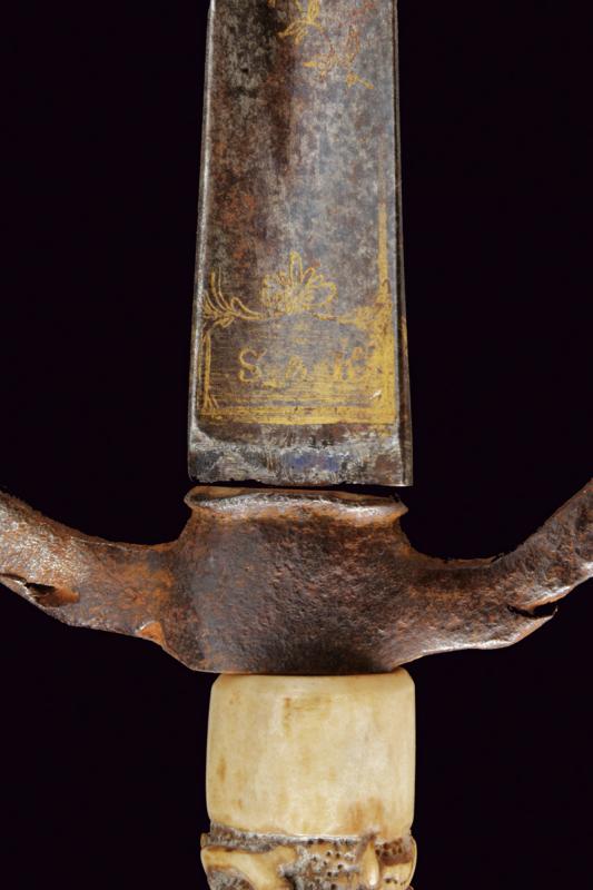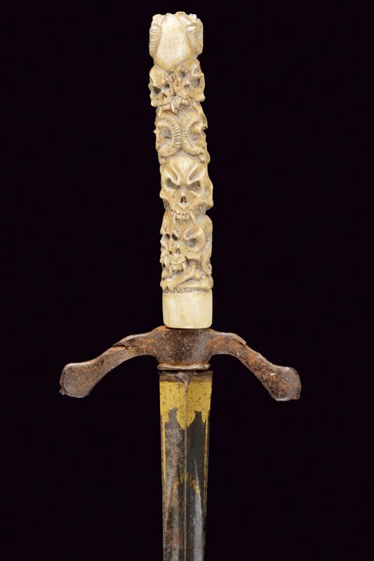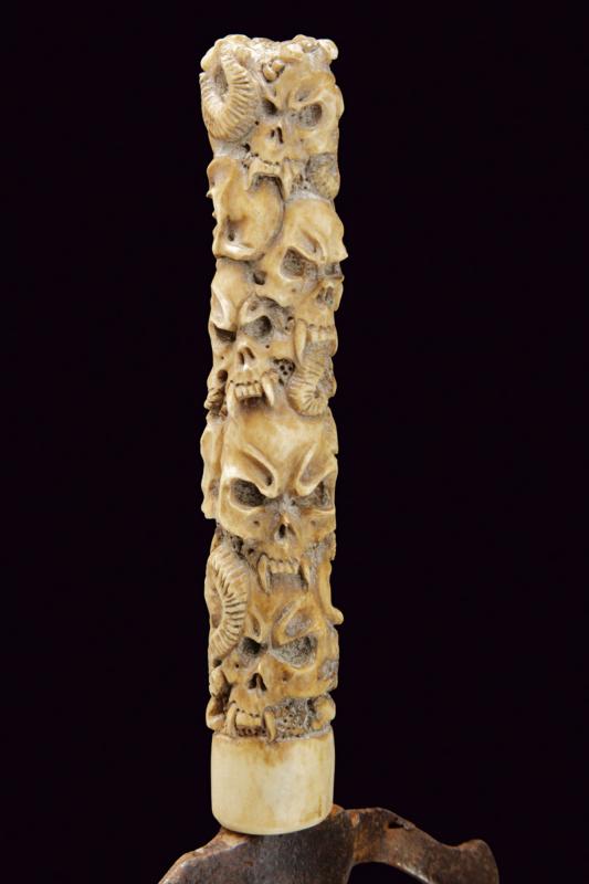 Lotto di due spadini massonici, datazione: Prima metà del XIX Secolo provenienza: Europa, Lame triangolari con resti di incisioni dorate, una marcata alla base 'S&K'. Elso di tipo diverso in ferro, uno con decorazioni in argento (probabilmente inglese). Impugnature in osso scolpito con teschi, uno anche con corna. lunghezza 71 - 71-5 cm.