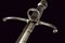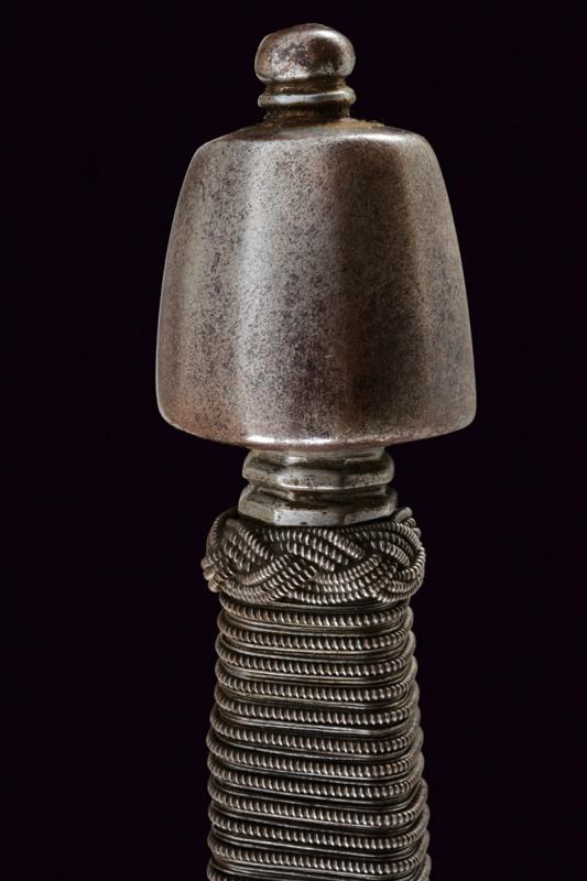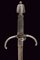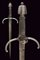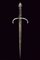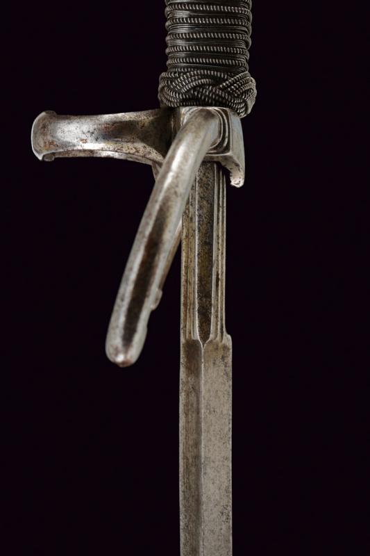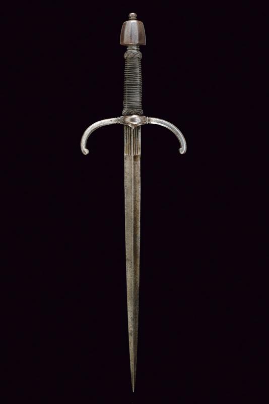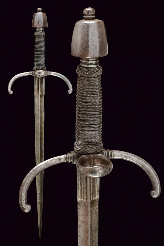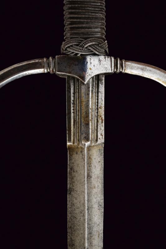Mano sinistra, datazione: 1600 circa provenienza: Germania, Robusta lama dritta di sezione a losanga con facce delicatamente incavate, tallone con scanalature longitudinali. Fornimento in ferro con bracci dell'elso incurvati verso la lama e leggermente alzate, massello con anello di parata. Pomo faccettato. Impugnatura in legno rivestito di trecciola e teste di moro in filo di ferro. lunghezza 50 cm.
