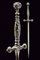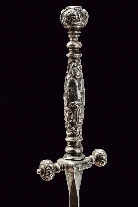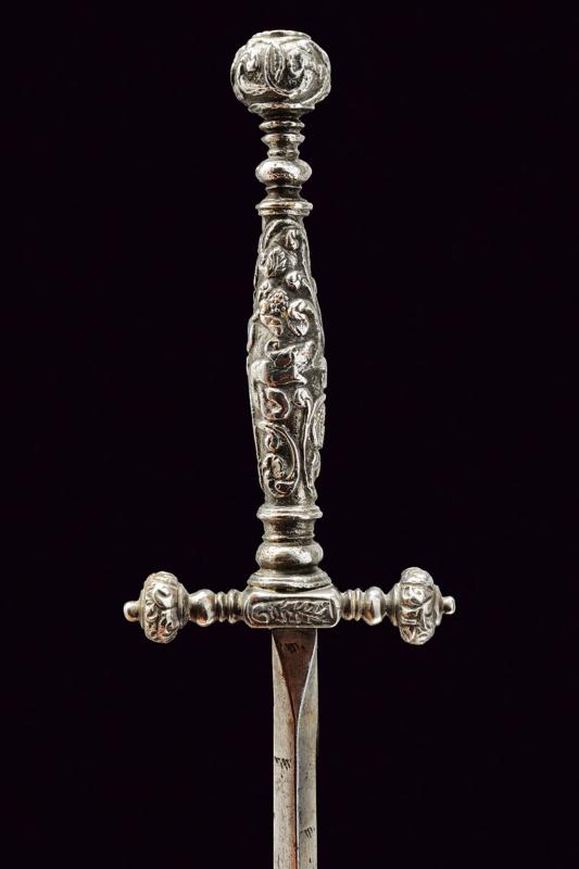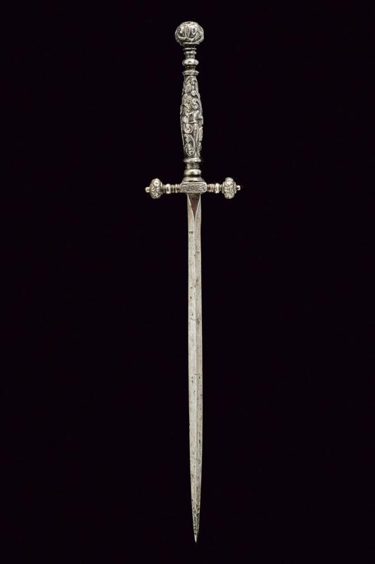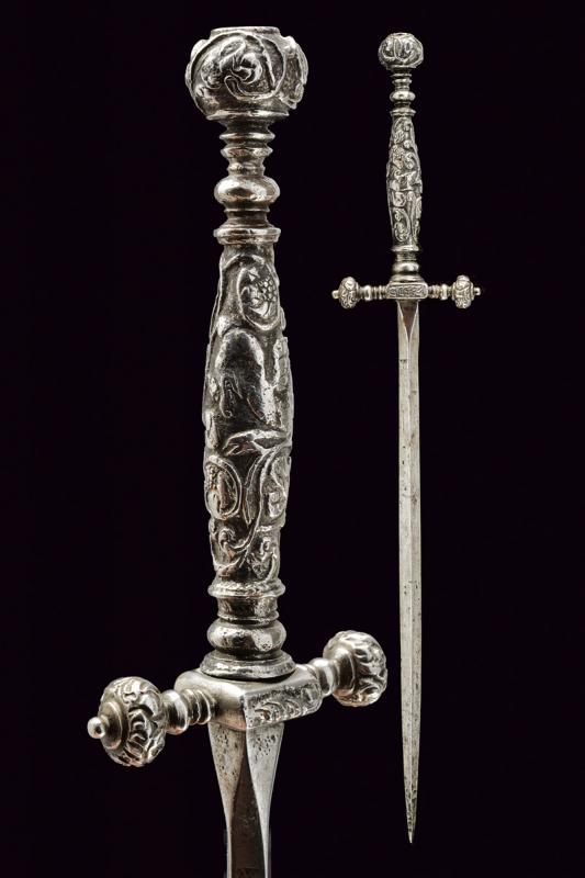 Stiletto, datazione: XVII Secolo provenienza: Italia, Lama dritta di sezione quadra. Elso in ferro a bracci dritti con collo tornito a balaustro e con estremità ingrossate e lavorate a racemi in rilievo, munite di bottoncino. Il massello con foglie in rilievo. Impugnatura a fuso lavorata in bassorilievo con decorazioni a grottesche con mostri e racemi. Il pomo su collo con anellature e racemi en suite. lunghezza 31,7 cm.