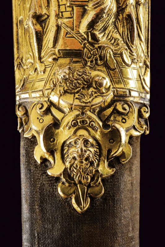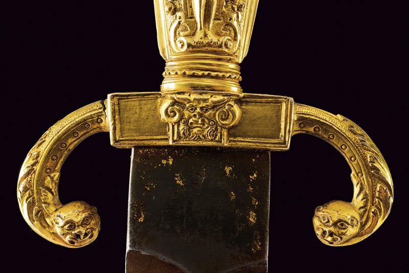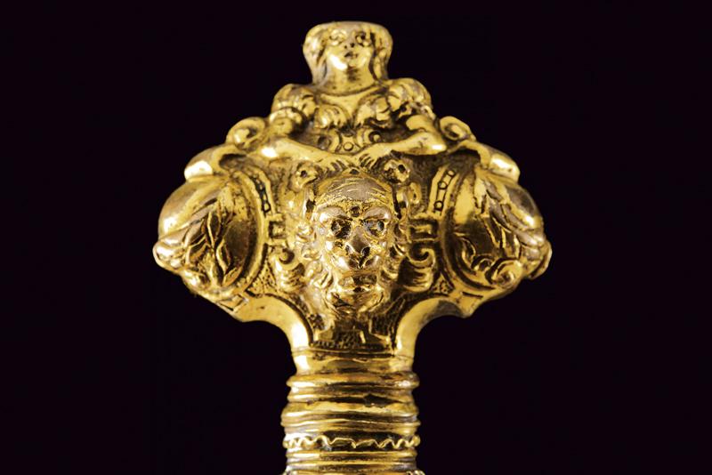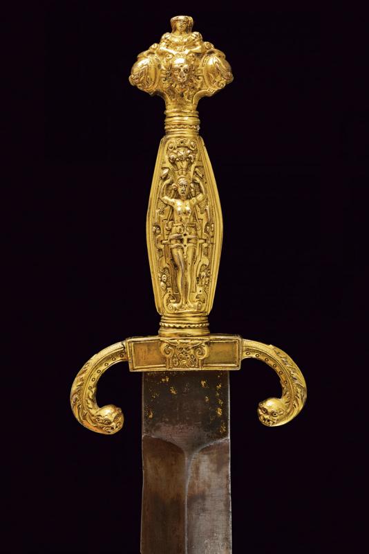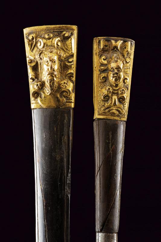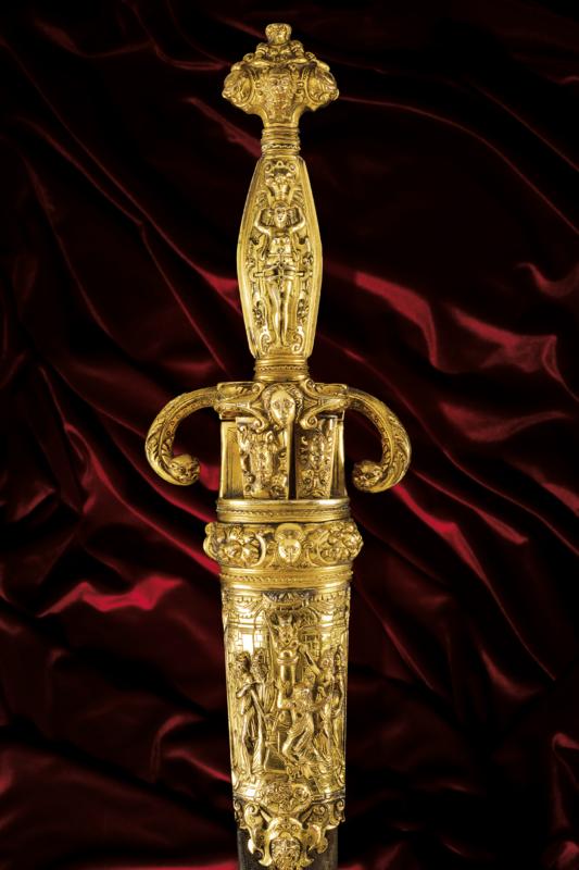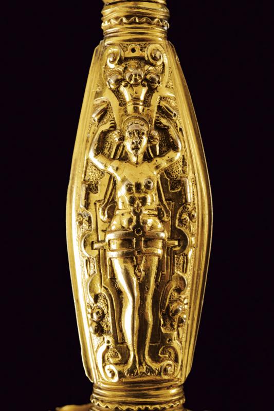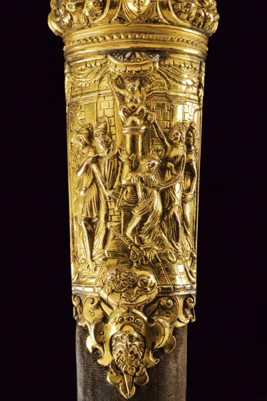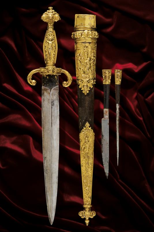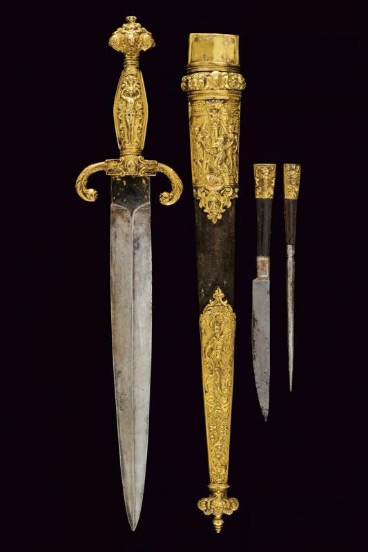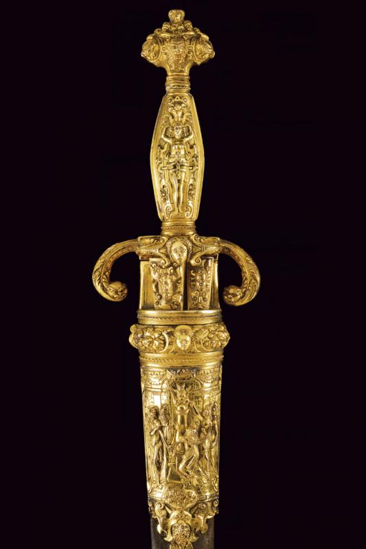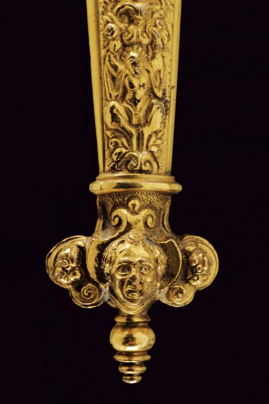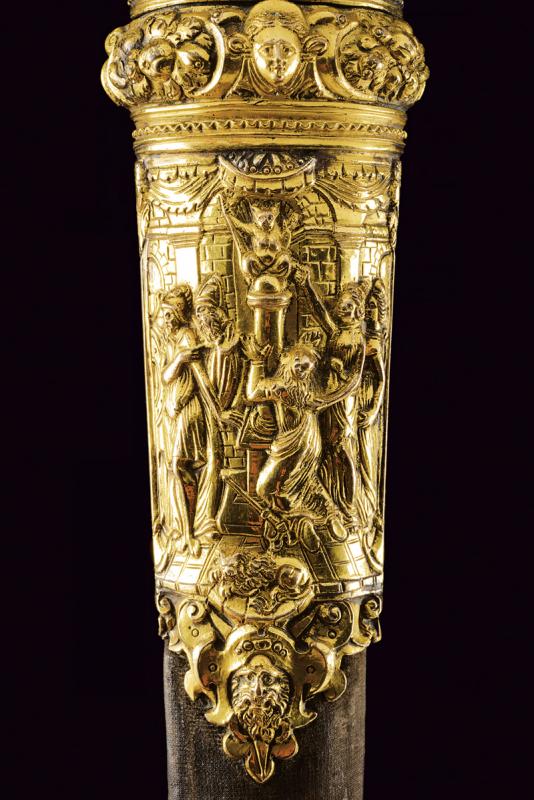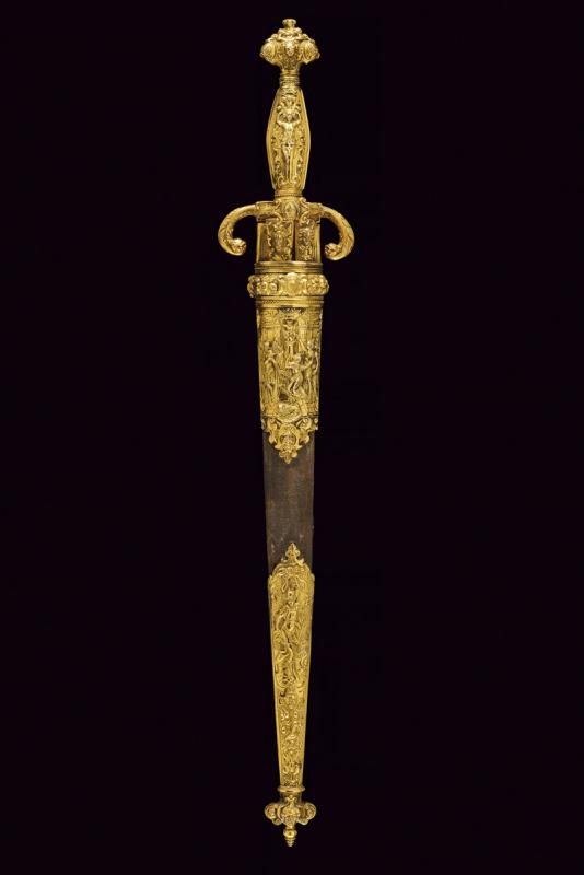 Bellissimo e unico pugnale rinascimentale, datazione: 1570 circa provenienza: Francia, Robusta lama dritta costolata in mezzeria, di sezione a losanga. Il tallone di sezione rettangolare e di forma appuntita al centro, recante resti di doratura e brunitura, munito sul lato di quarta di un punzone a forma di volatile stilizzato. Elegante fornimento in bronzo dorato, parzialmente abraso. Massello a parallelepipedo (venato su un lato) con cornici ai bordi e un volto di Pan in bassorilievo su entrambi i lati, bracci dell'elso incurvati verso la lama (uno incrinato e leggermente piegato), decorati a motivi floreali e con mascheroni d'animali alle estremità, anche questi su entrambi i lati. Anello di parata intagliato a foglie e volute che sorreggono un volto muliebre in rilievo al centro. Pomo quadrilobato, lavorato in due metà congiunte al centro, sormontato dal busto di una dama bifronte che costituisce il bottone; il lobo anteriore e quello posteriore intagliati a testa di leone, i due laterali bulbiformi e arricchiti da ghirlande, sempre in rilievo. L'impugnatura recante una figura muliebre nuda, in rilievo, che sorregge un vaso di fiori, cinta da fasce e circondata da elementi architettonici e fiori. Fodero in legno, rivestito di velluto (completamente liso) con stupendi fornimenti in bronzo dorato. Cappa recante una scena nella quale un gruppo di personaggi è intento ad adorare un idolo (una sorta di figura demoniaca scimmiesca) posto su di una colonna: al centro e a destra tre dame in vesti d'epoca classica, di cui una inginocchiata, a sinistra due personaggi maschili, uno con elmo, l'altro con lunga barba e cappello conico, sotto a tutti i personaggi un leone accovacciato, il fondo della cappa con un grande mascherone. La parte alta della cappa recante un'anellatura bombata munita al centro di un mascherone circondato da fiori e frutti. Nella parte superiore del fodero un'imboccatura aggiuntiva a doppio scasso, all’interno di questa un coltello ed un punteruolo dotati di impugnatura lignea con cappellotto in ottone dorato decorato con mascheroni in rilievo. Il lungo puntale decorato con bellissima effige di Ermes, messaggero degli Dei, sormontato da una ghirlanda; in basso un mascherone, fiori e un'effige che riprende l'idolo adorato sulla cappa. L'estremità inferiore lavorata similmente al pomo ma di dimensioni ridotte e con volti maschili. Il retro della cappa inciso a rombi, con una grande croce e dotato di un passante, il bordo festonato e inciso a foglie. Il retro del puntale lavorato a motivi floreali. Questo stupendo pugnale reca sicuramente molti dettagli riscontrabili su lavori di Hans Holbein il Vecchio (Augsburg, 1460 – Issenheim, 1524). Cfr: vedi una serie di daghe svizzere nella Wallace Collection, illustrate in 'European Arms and Armour - Volume II Arms', tavola 137, che presentano vari somiglianze al nostro, quali il pomo della daga A 768, i puntali dell'esemplare A 769 e A 770 ed il disegno della cappa dell' A 768 (che sul nostro pugnale si trova sul lato posteriore). Il punzone sulla lama è molto simile ai marchi del n. A 768, e ricorda vagamente anche quelli dell' A 769 e A 770. Vedi anche il coltello ed il punteruolo, molto somiglianti, nella daga conservata nel Victoria and Albert Museum di Londra, la quale rassomiglia alla nostra anche nel puntale e nella decorazione incisa alla cappa. Anche il soggetto degli elementi decorativi di questo pugnale è di estremo interesse, in quanto il tema che viene suggerito è di tipo non soltanto pagano, ma esoterico: L’immagine principale difatti, ovvero la scena presente sulla cappa, è un esplicito rimando esoterico, nella quale l’idolo adorato sulla colonna è probabilmente Lucifero stesso, effigiato all’interno di un edificio, in una nicchia sotto ad un baldacchino (Lucifero, portatore di Luce, non ha necessità della luce del sole, poiché è luce egli stesso), raffigurato con fattezze mostruose nell’atto di spalancare le braccia reggendo uno scettro e (forse) una cornucopia. Alla sua destra è adorato da dame a sinistra da un uomo barbuto nell’atto di giurare, e da uno cinto da elmo che indica (o scaglia) a terra una fiaccola (o una bilancia). Il pomo con il bottone a figura muliebre bifronte può richiamare il mito di Giano, che vede il futuro e il passato. Le figure nude sull’impugnatura possono essere anche interpretate come vittime sacrificali legate da cinghie ad un altare. Il retro della cappa reca l’effige di un grande crocifisso, ma questo ha bracci incisi di modo che ogni elemento abbia sia un lato chiaro che uno scuro, inoltre il fogliame alla base della stessa può essere anche interpretato come fiamme. La raffigurazione di Ermes, messaggero degli dei ma anche dio della scrittura e della Magia. Il massello reca teste di Pan, ovviamente assimilate anche all’iconografia del Diavolo. Una daga straordinaria che merita uno studio adeguato delle sue uniche caratteristiche. Restauri museali. lunghezza 38,2 cm.