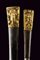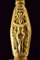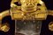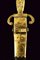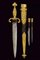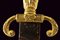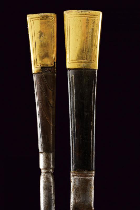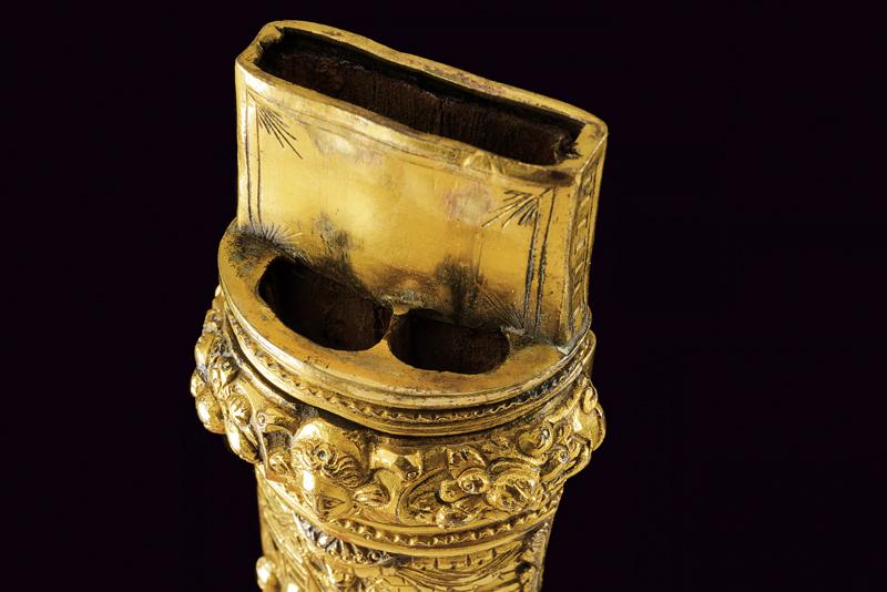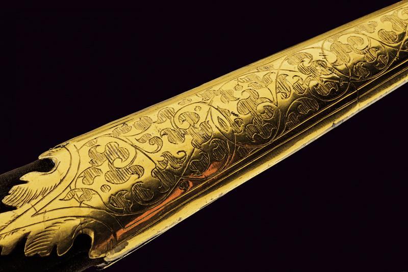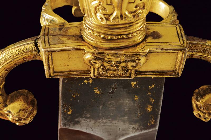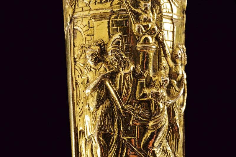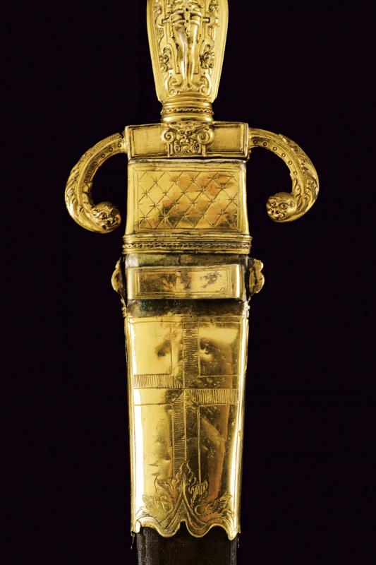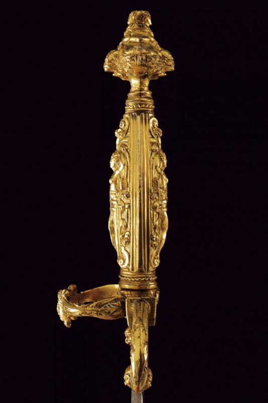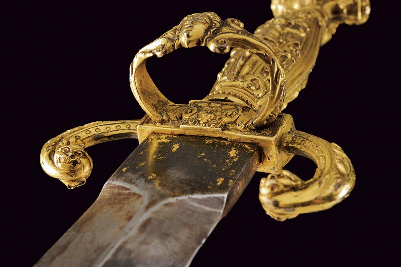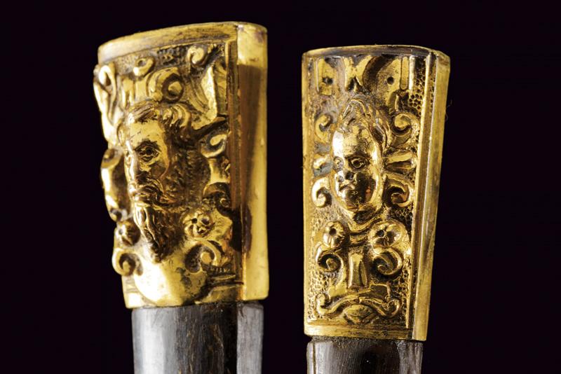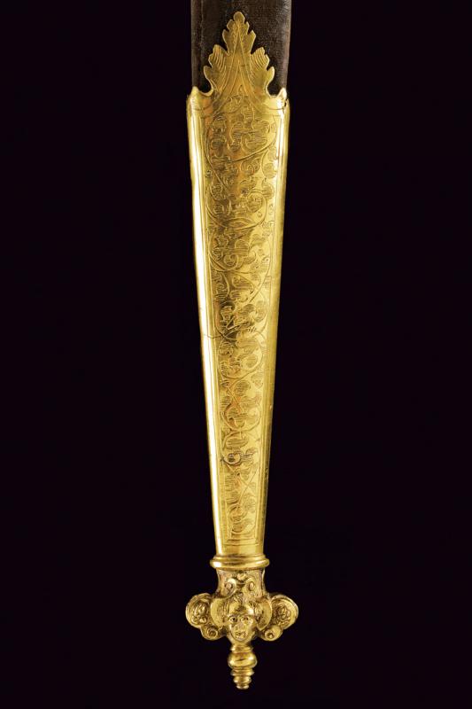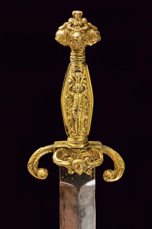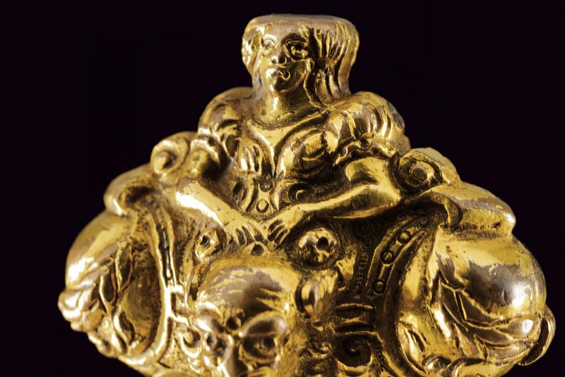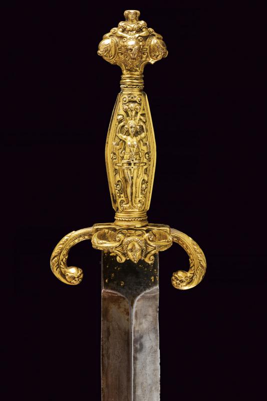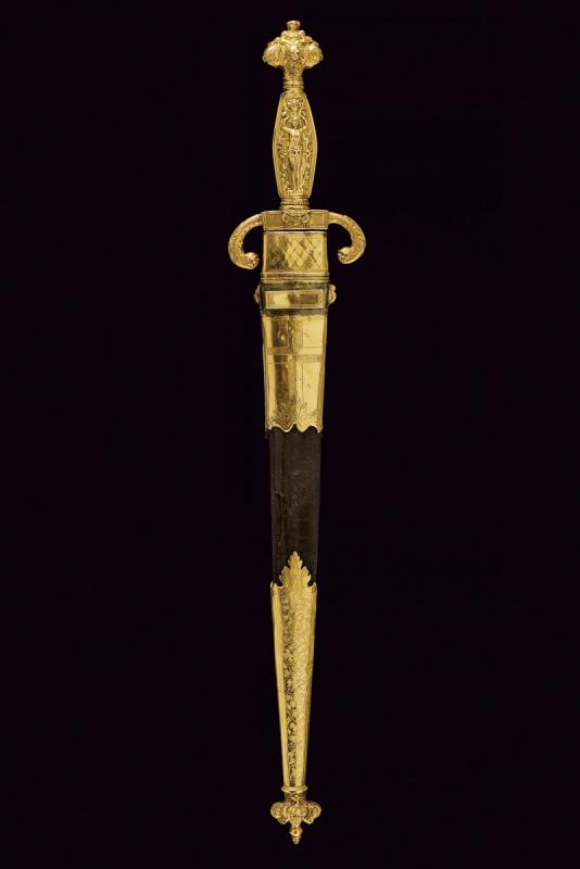 Bellissimo e unico pugnale rinascimentale, datazione: 1570 circa provenienza: Francia, Robusta lama dritta costolata in mezzeria, di sezione a losanga. Il tallone di sezione rettangolare e di forma appuntita al centro, recante resti di doratura e brunitura, munito sul lato di quarta di un punzone a forma di volatile stilizzato. Elegante fornimento in bronzo dorato, parzialmente abraso. Massello a parallelepipedo (venato su un lato) con cornici ai bordi e un volto di Pan in bassorilievo su entrambi i lati, bracci dell'elso incurvati verso la lama (uno incrinato e leggermente piegato), decorati a motivi floreali e con mascheroni d'animali alle estremità, anche questi su entrambi i lati. Anello di parata intagliato a foglie e volute che sorreggono un volto muliebre in rilievo al centro. Pomo quadrilobato, lavorato in due metà congiunte al centro, sormontato dal busto di una dama bifronte che costituisce il bottone; il lobo anteriore e quello posteriore intagliati a testa di leone, i due laterali bulbiformi e arricchiti da ghirlande, sempre in rilievo. L'impugnatura recante una figura muliebre nuda, in rilievo, che sorregge un vaso di fiori, cinta da fasce e circondata da elementi architettonici e fiori. Fodero in legno, rivestito di velluto (completamente liso) con stupendi fornimenti in bronzo dorato. Cappa recante una scena nella quale un gruppo di personaggi è intento ad adorare un idolo (una sorta di figura demoniaca scimmiesca) posto su di una colonna: al centro e a destra tre dame in vesti d'epoca classica, di cui una inginocchiata, a sinistra due personaggi maschili, uno con elmo, l'altro con lunga barba e cappello conico, sotto a tutti i personaggi un leone accovacciato, il fondo della cappa con un grande mascherone. La parte alta della cappa recante un'anellatura bombata munita al centro di un mascherone circondato da fiori e frutti. Nella parte superiore del fodero un'imboccatura aggiuntiva a doppio scasso, all’interno di questa un coltello ed un punteruolo dotati di impugnatura lignea con cappellotto in ottone dorato decorato con mascheroni in rilievo. Il lungo puntale decorato con bellissima effige di Ermes, messaggero degli Dei, sormontato da una ghirlanda; in basso un mascherone, fiori e un'effige che riprende l'idolo adorato sulla cappa. L'estremità inferiore lavorata similmente al pomo ma di dimensioni ridotte e con volti maschili. Il retro della cappa inciso a rombi, con una grande croce e dotato di un passante, il bordo festonato e inciso a foglie. Il retro del puntale lavorato a motivi floreali. Questo stupendo pugnale reca sicuramente molti dettagli riscontrabili su lavori di Hans Holbein il Vecchio (Augsburg, 1460 – Issenheim, 1524). Cfr: vedi una serie di daghe svizzere nella Wallace Collection, illustrate in 'European Arms and Armour - Volume II Arms', tavola 137, che presentano vari somiglianze al nostro, quali il pomo della daga A 768, i puntali dell'esemplare A 769 e A 770 ed il disegno della cappa dell' A 768 (che sul nostro pugnale si trova sul lato posteriore). Il punzone sulla lama è molto simile ai marchi del n. A 768, e ricorda vagamente anche quelli dell' A 769 e A 770. Vedi anche il coltello ed il punteruolo, molto somiglianti, nella daga conservata nel Victoria and Albert Museum di Londra, la quale rassomiglia alla nostra anche nel puntale e nella decorazione incisa alla cappa. Anche il soggetto degli elementi decorativi di questo pugnale è di estremo interesse, in quanto il tema che viene suggerito è di tipo non soltanto pagano, ma esoterico: L’immagine principale difatti, ovvero la scena presente sulla cappa, è un esplicito rimando esoterico, nella quale l’idolo adorato sulla colonna è probabilmente Lucifero stesso, effigiato all’interno di un edificio, in una nicchia sotto ad un baldacchino (Lucifero, portatore di Luce, non ha necessità della luce del sole, poiché è luce egli stesso), raffigurato con fattezze mostruose nell’atto di spalancare le braccia reggendo uno scettro e (forse) una cornucopia. Alla sua destra è adorato da dame a sinistra da un uomo barbuto nell’atto di giurare, e da uno cinto da elmo che indica (o scaglia) a terra una fiaccola (o una bilancia). Il pomo con il bottone a figura muliebre bifronte può richiamare il mito di Giano, che vede il futuro e il passato. Le figure nude sull’impugnatura possono essere anche interpretate come vittime sacrificali legate da cinghie ad un altare. Il retro della cappa reca l’effige di un grande crocifisso, ma questo ha bracci incisi di modo che ogni elemento abbia sia un lato chiaro che uno scuro, inoltre il fogliame alla base della stessa può essere anche interpretato come fiamme. La raffigurazione di Ermes, messaggero degli dei ma anche dio della scrittura e della Magia. Il massello reca teste di Pan, ovviamente assimilate anche all’iconografia del Diavolo. Una daga straordinaria che merita uno studio adeguato delle sue uniche caratteristiche. Restauri museali. lunghezza 38,2 cm.