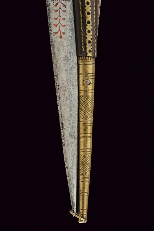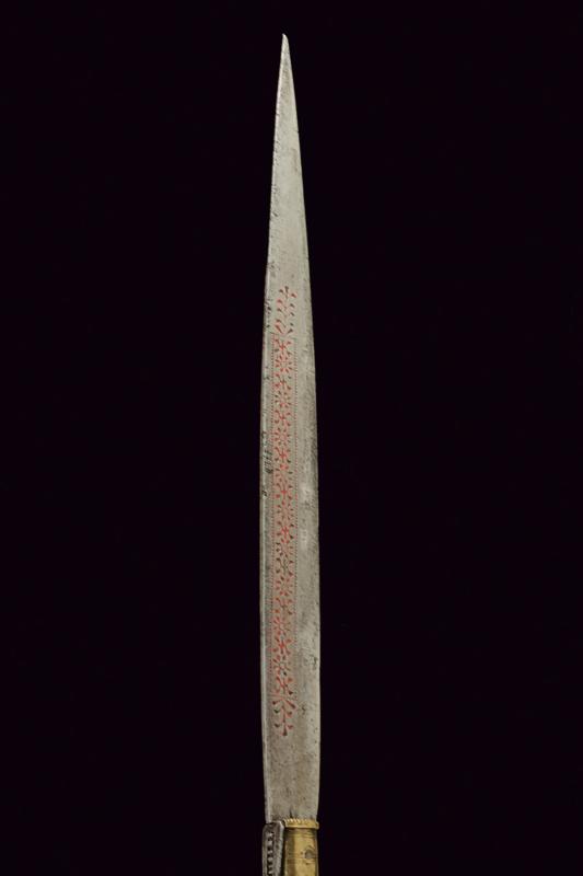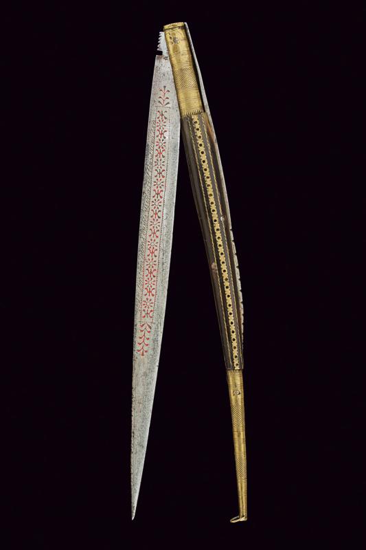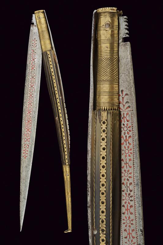 Navaja, datazione: Fine del XIX Secolo provenienza: Spagna, Lunga lama a un filo riccamente incisa e dipinta parzialmente di rosso, lungo il dorso iscrizione su un lato.Impugnatura in legno con intarsi in ottone inciso. Il dorso con lunga molla intagliata e con resti di pittura rossa. lunghezza open 79.5 cm.