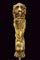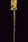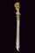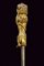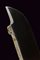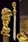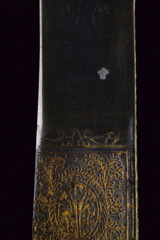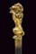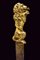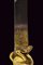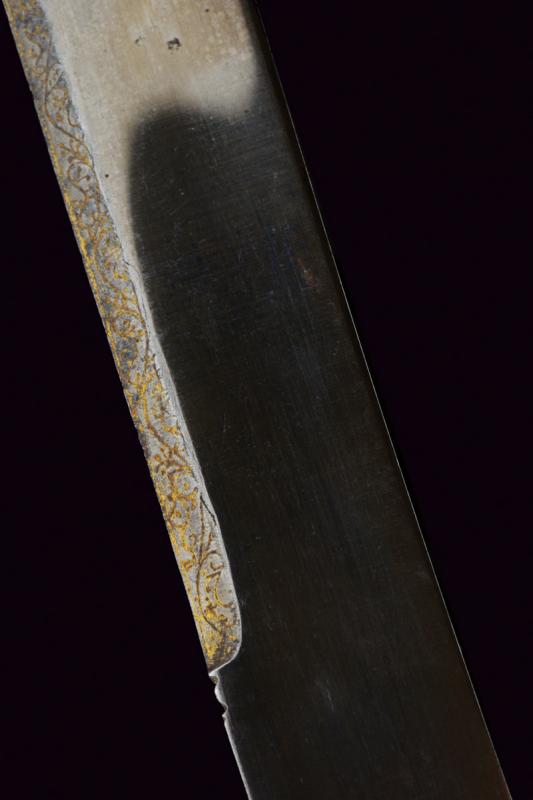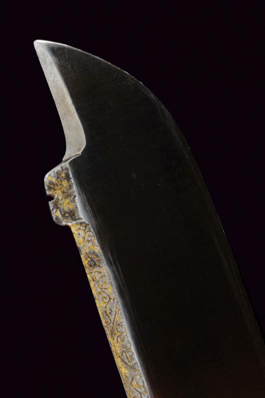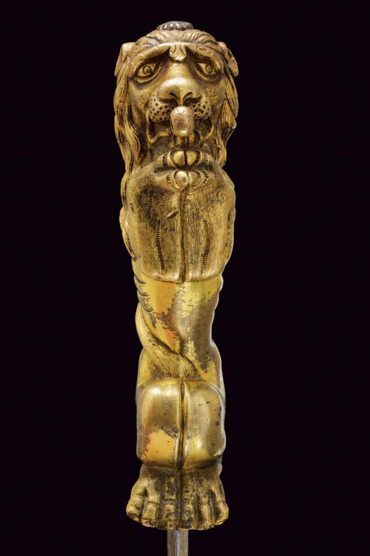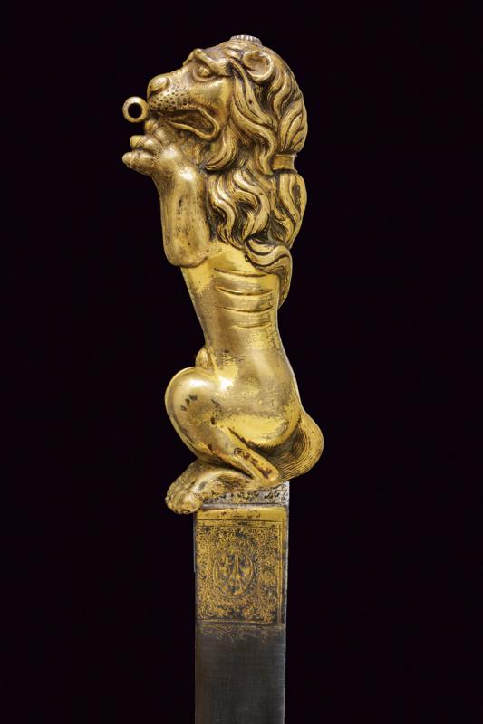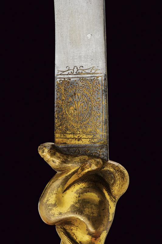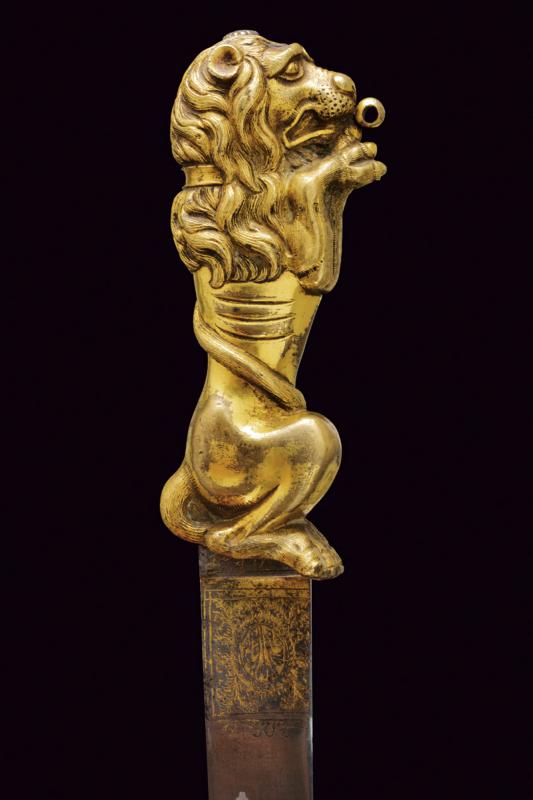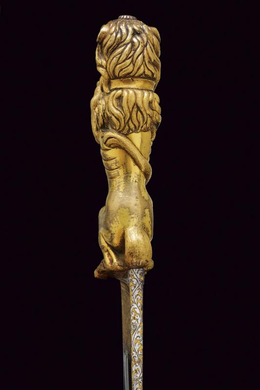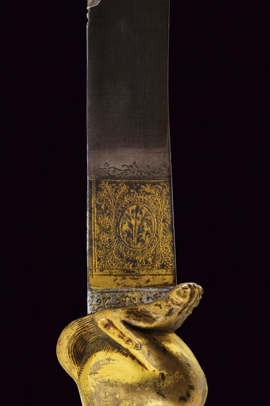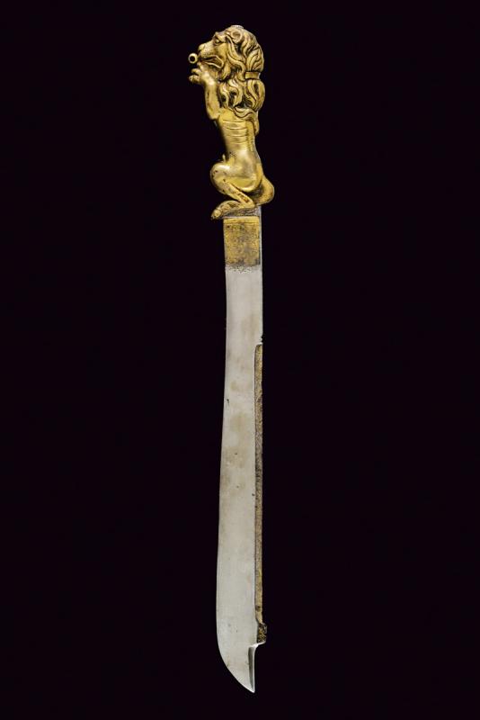 Inusuale e raro coltello in bronzo dorato, datazione: 1600 circa provenienza: Fiandre, Interessante e rara lama in ferro a un filo e breve controfilo e punta incavata, la base finemente incisa a motivi floreali, il dorso prima piatto, poi triangolare ed in fine con gobba, tutto inciso a fiorame in oro. Bellissima impugnatura, maestosamente eseguita, raffigurante un leone in bronzo con resti di doratura al mercurio. lunghezza 48 cm.