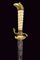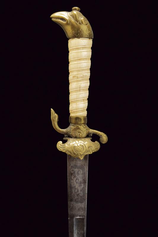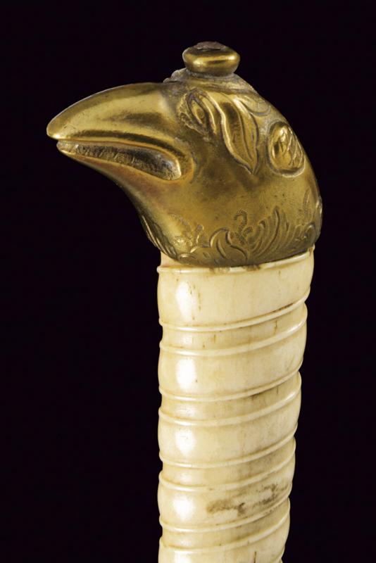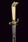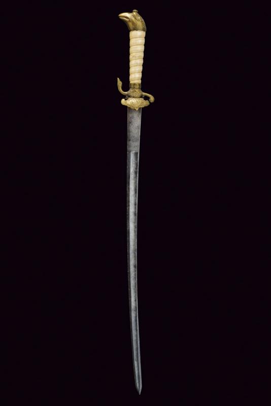Paloscio da caccia, datazione: fine del XVIII Sec. provenienza: Germania, Lama a un filo e controfilo con ampio sguscio centrale e sottile scanalatura dorsale, la prima parte incisa con cervo, cinghiale, segugi e motivi floreali e geometrici; fornimento in ottone con un braccio dell'elso e pomo decorato a teste di aquila. Impugnatura in corno di cervo scolpito a bande. lunghezza 68.5 cm.