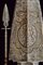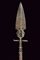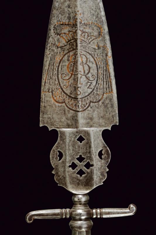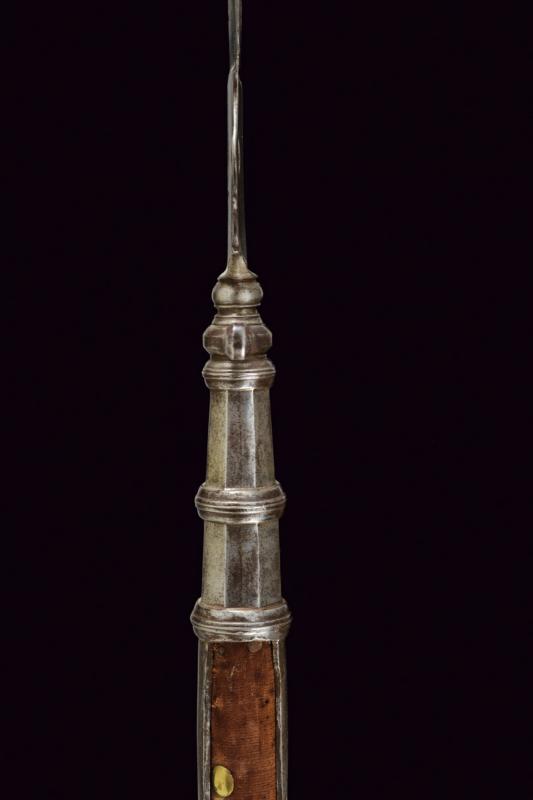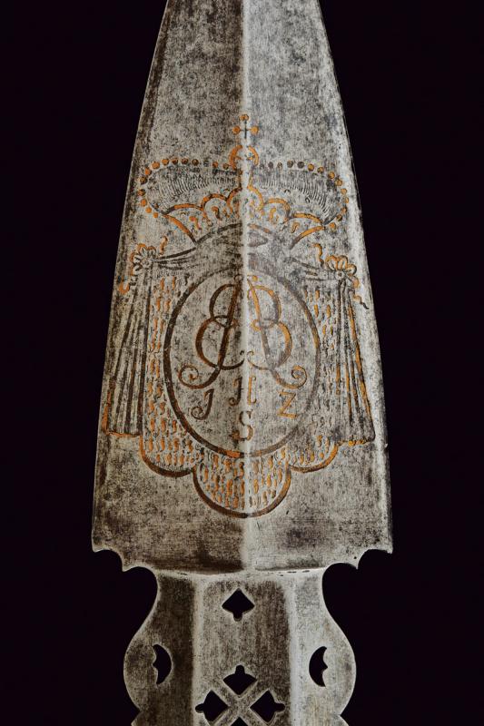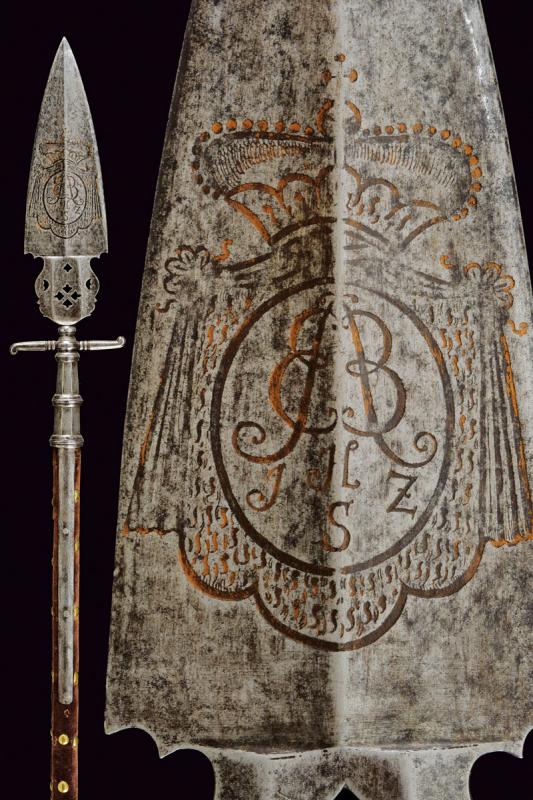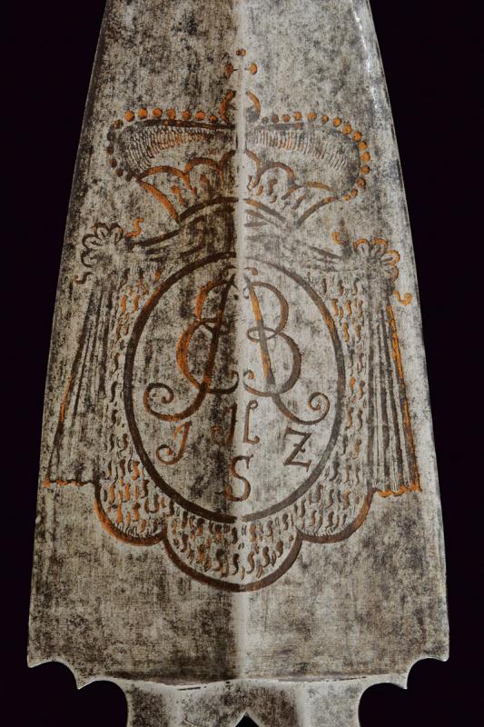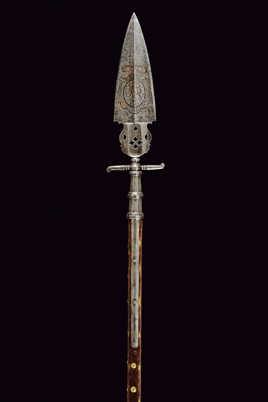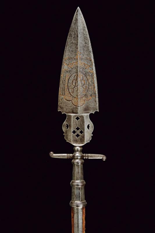 Spuntone da ufficiale, datazione: XVIII Secolo provenienza: Europa, Lama triangolare a due fili leggermenti convessi, costolata in mezzeria ed incisa con un monogramma 'AB' sotto corona e sopra le lettere 'J H Z S' la base traforata e posata a due resti a 'S', gorbia faccettata e suddiviso da tre anelli. Lunghe bandelle in ferro. Fusto in legno rivestito di velluto marrone e con rivetti in ottone, probabilmente di epoca successiva. altezza 183 cm.