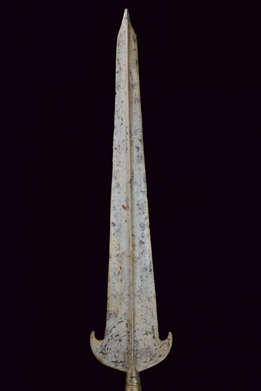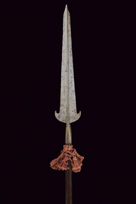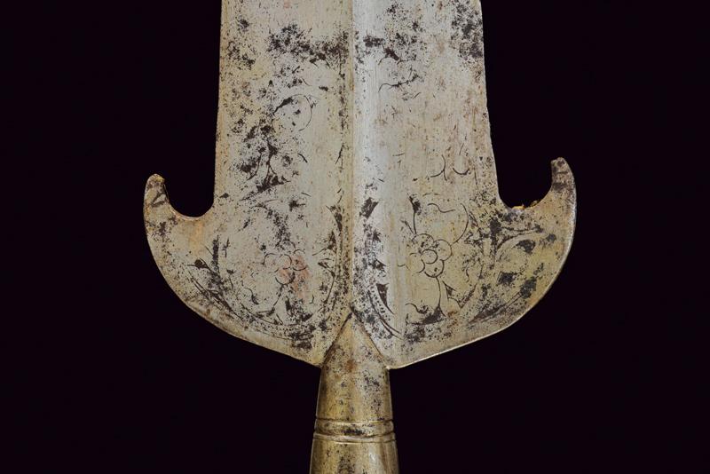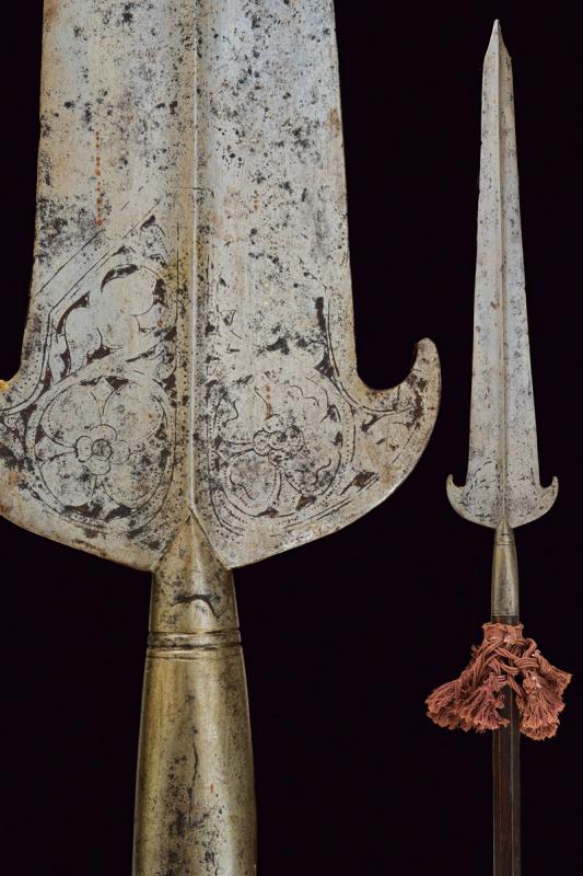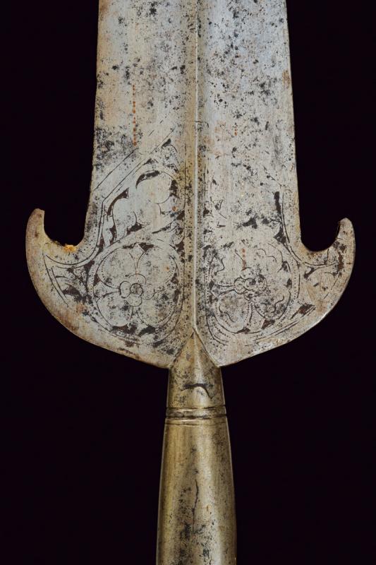 Partigiana incisa, datazione: 1600 circa provenienza: Italia, Lunga cuspide dritta a lama con a fili, nervata al centro, munita di alette. La base finemente incisa a motivi floreali su entrambi i lati. Gorbia troncoconica. Su asta lignea probabilmente più tarda e nappa moderna. lunghezza 268.5 cm.