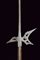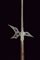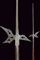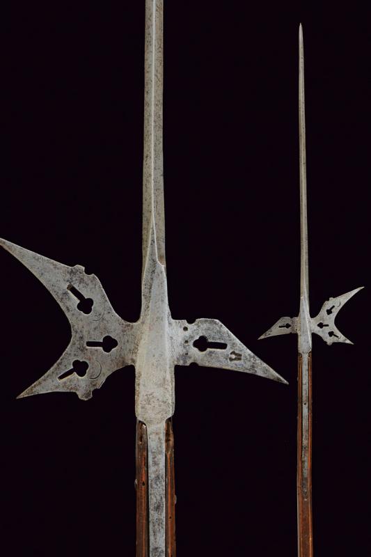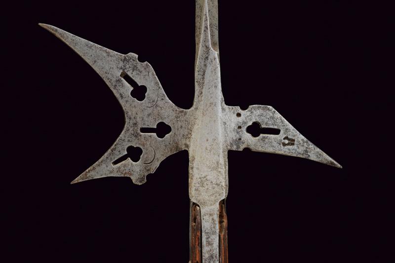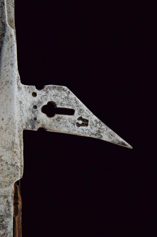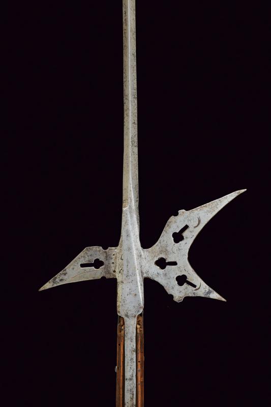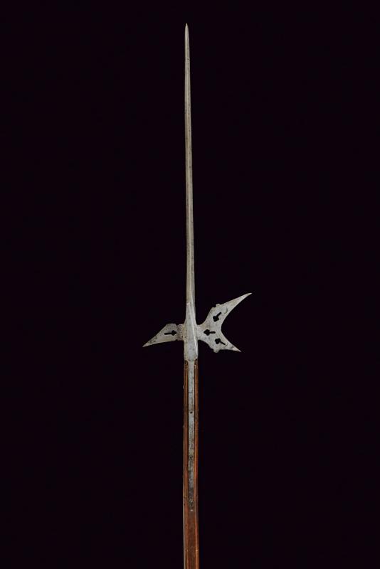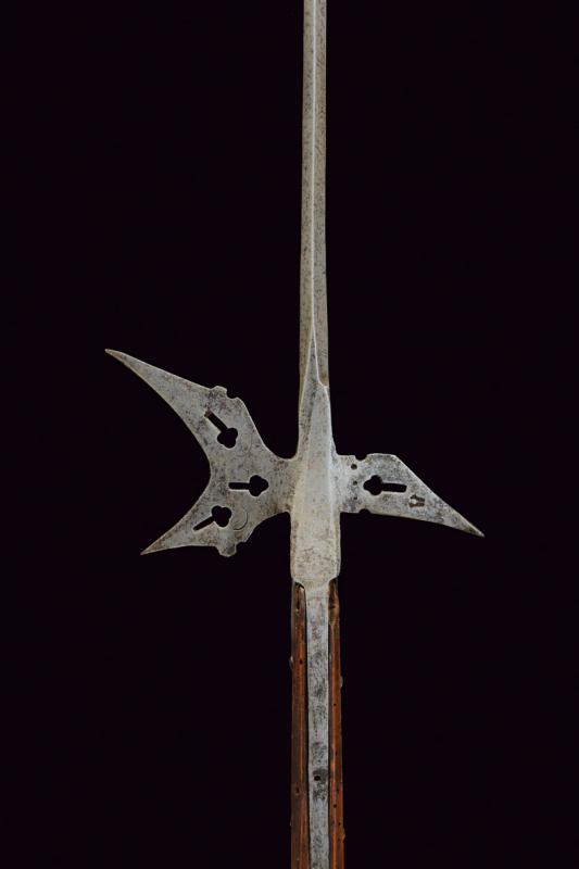 Alabarda, datazione: 1600 circa provenienza: Italia, Testa in ferro con lunga cuspide a sezione di losanga. Scure fortemente incavata, munita di gobbe e di tre grandi sforature, becco angolato verso il basso traforato en suite e con resti di una marca su una faccia. Bandelle e controbandelle di lunghezze differenti. Alcuni ribattini mancanti. Su asta lignea danneggiata (più tarda?). altezza 240 cm.
