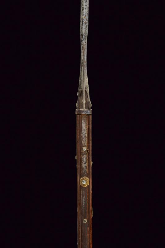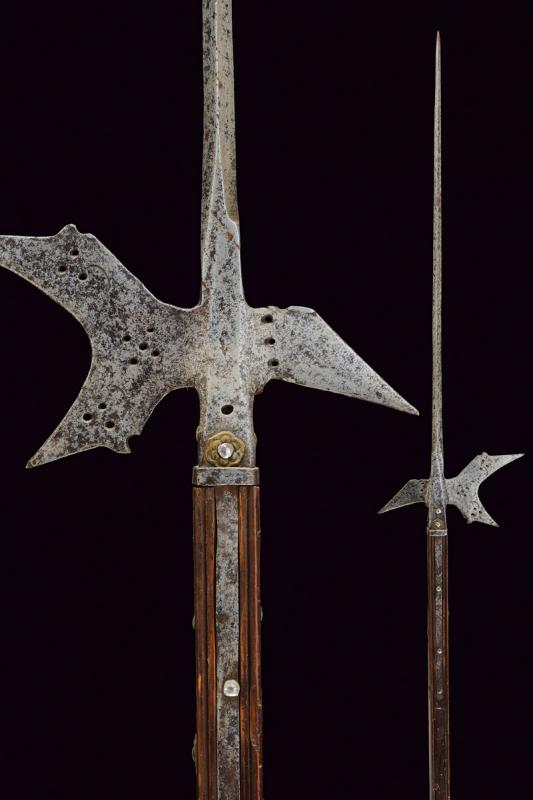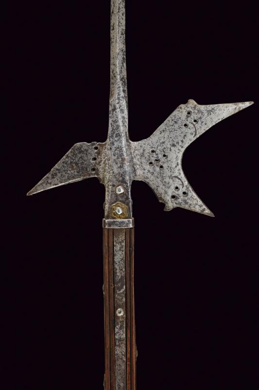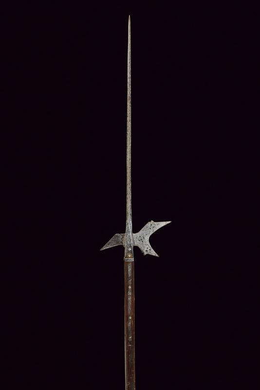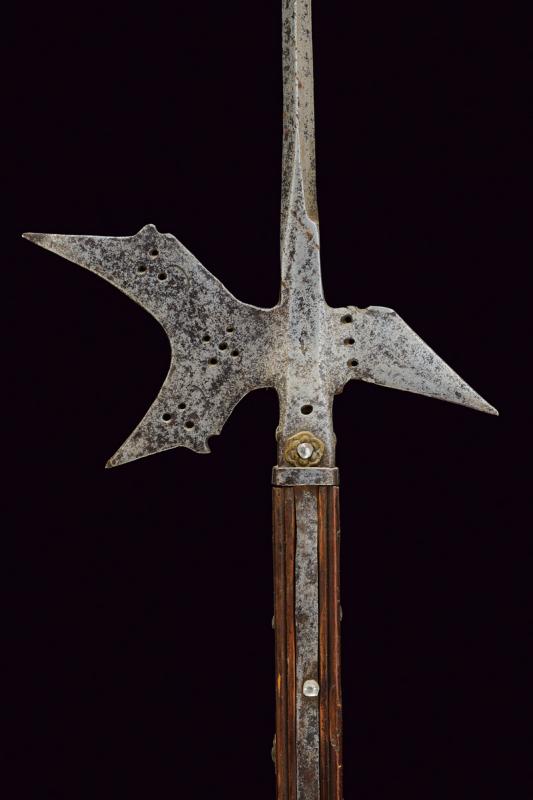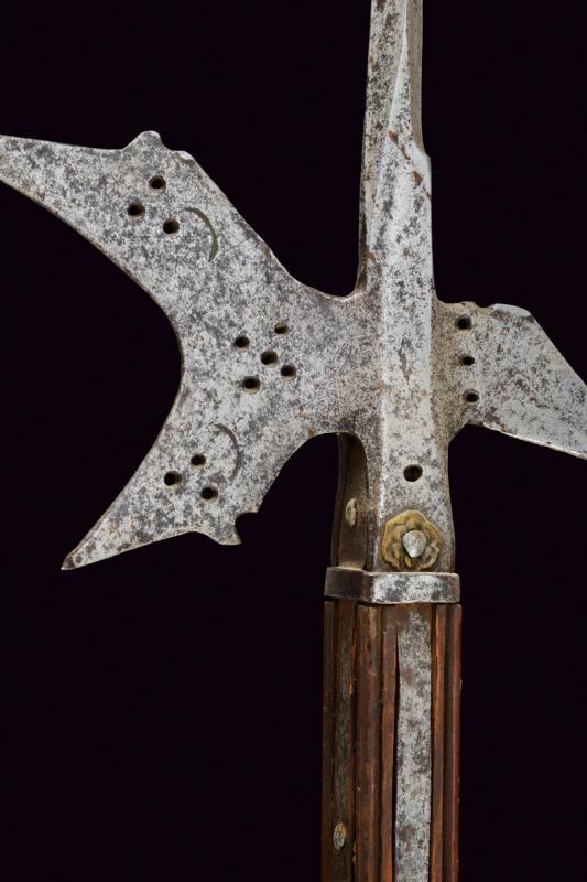 Alabarda, datazione: 1600 circa provenienza: Italia, Testa in ferro con lunga cuspide di sezione quadra. Scure fortemente incavata, munita di gobbe a becchetto e con piccole sforature circolari, becco angolato verso il basso, anche questo con sforature alla base e con resti di una marca su una faccia. Ghiera in ferro alla base. Bandelle e controbandelle di lunghezze differenti. Alcuni ribattini con rosetta in ottone. Su asta lignea (più tarda?) delineata. altezza 254 cm.