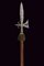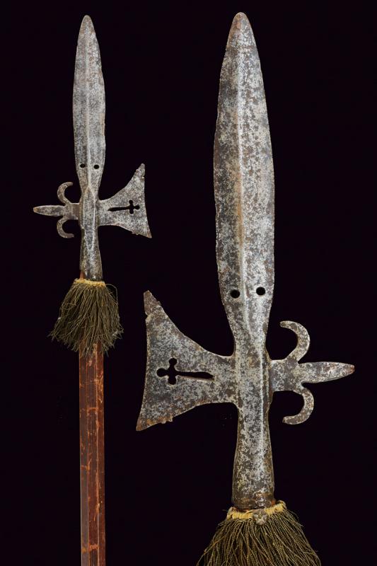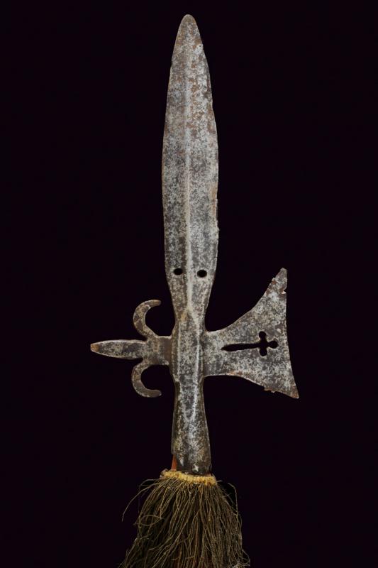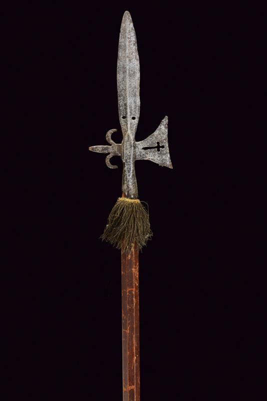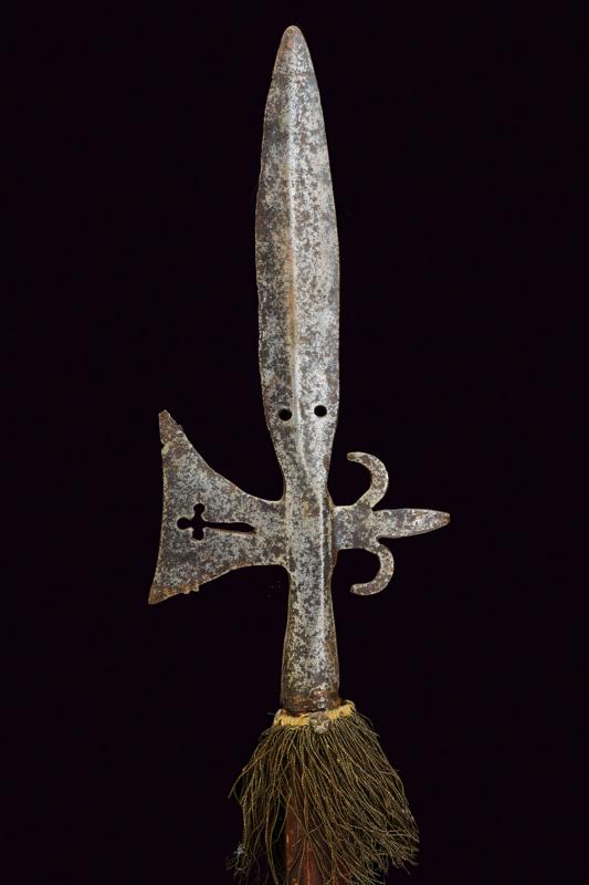 Alabarda da caccia, datazione: Seconda metà del XVI secolo provenienza: Europa, Ferro con grande cuspide a foglia, a due fili, costolata al centro. Scure a taglio quasi dritto con traforo centrale a croce. Becco dritto lavorato a giglio. Gorbia troncoconica mancante di bandelle. Asta più recente, munita di nappina a frange. altezza 209 cm.