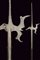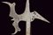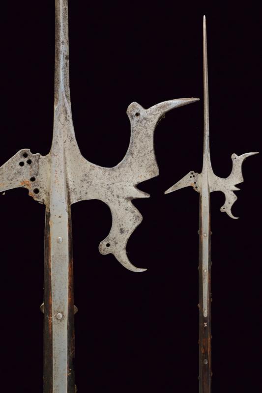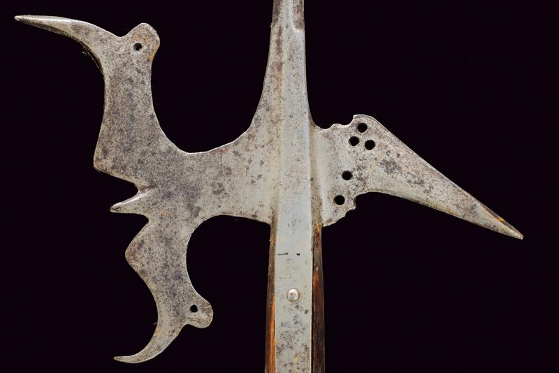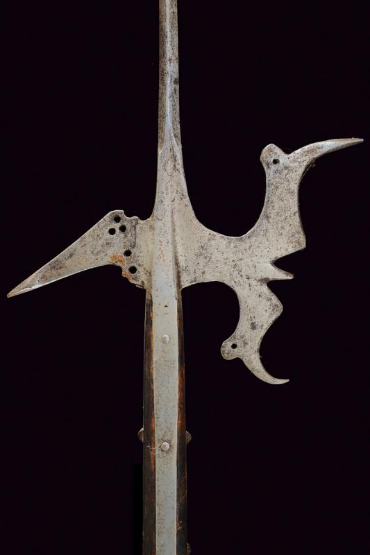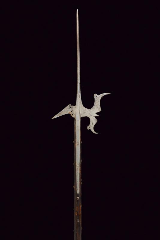 Alabarda, datazione: inizio del XVI Sec. provenienza: Italia, Lunga cuspide di sezione a losanga, scure lavorata ad ali con piccola cuspide al centro, becco obliquo con punta rinforzata, come quella superiore della scure. Lunghe bandelle piatte. Asta lignea di sezione ottagonale decorato con rivetti a rosette e a forma piramidale. lunghezza 242 cm.