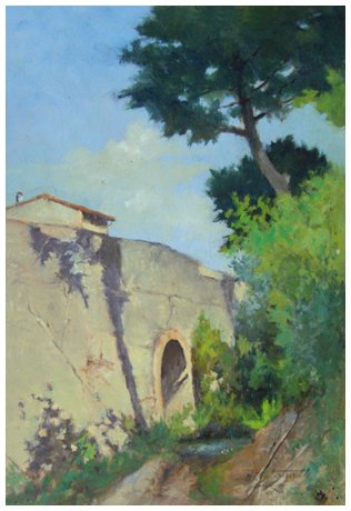 CESARE PELAGATTI Livorno 1890 – Livorno 1971 Via di Callusaia, il ponte (sotto) Olio su tavola 42,5 x 30. Firma in b. a d.; sul verso titolo e firma.