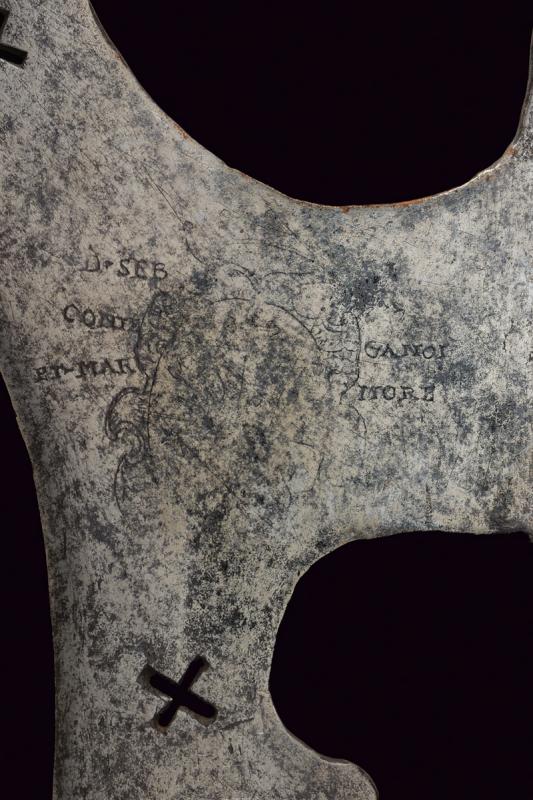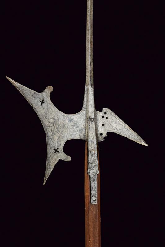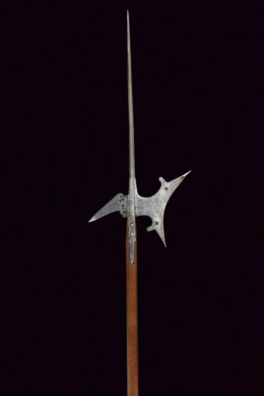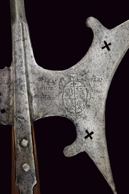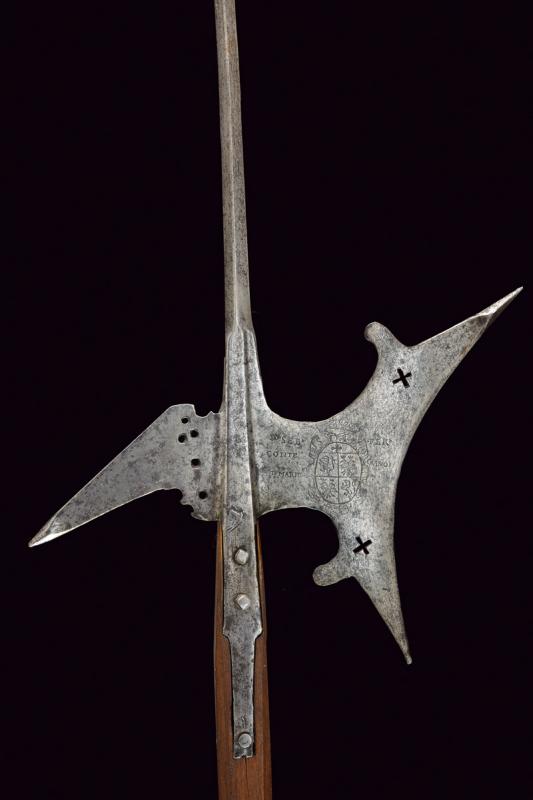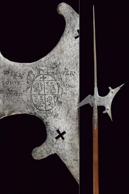 Alabarda con stemma, datazione: XVI Sec. provenienza: Italia, Lungo cuspide di sezione a losanga, scure con taglio concavo, punta superiore rinforzata, doppio traforo a croce ed incisa con stemma nobile sotto corona da conte con iscrizione non del tutto leggibile 'SEB CONTE PT MARMO - FER CANOI ...'. Becco obliquo con punta rinforzata e trafori alla base. Bandelle piatte accorciate. Fusto moderno. altezza 256 cm.