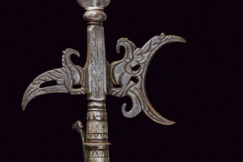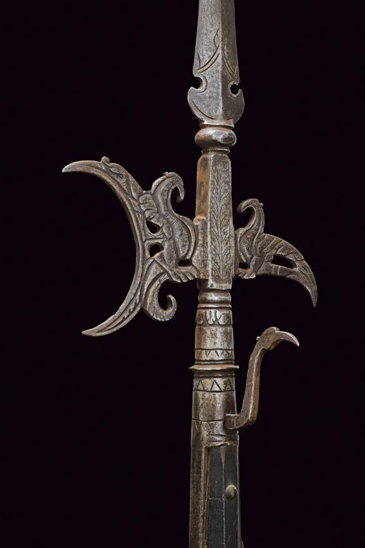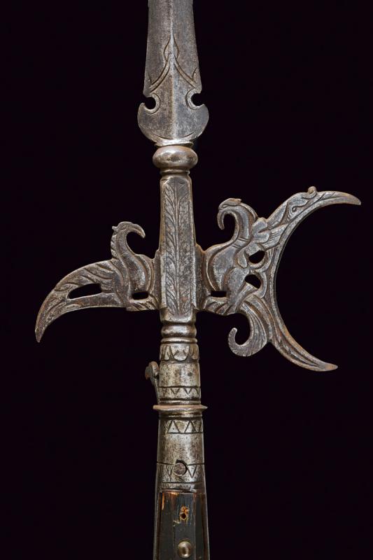 Rara alabarda intagliata, datazione: XVII Secolo provenienza: Italia, Scure concava e becco incurvato verso il basso, intagliata e traforata a volatili stilizzati, il massello inciso a motivi floreali. Cuspide a due fili costolata in mezzeria. Gorbia troncoconica intagliata a motivi geometrici e munita di un gancio laterale, incurvato e terminante in una testa di uccello. Lunghe bandelle su asta ottagonale antica decorata a rivetti in ottone. altezza 237.5 cm.