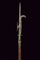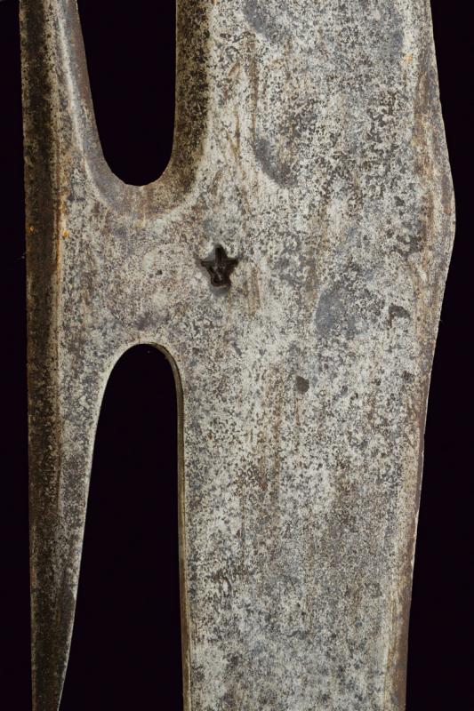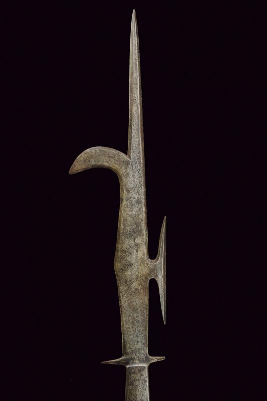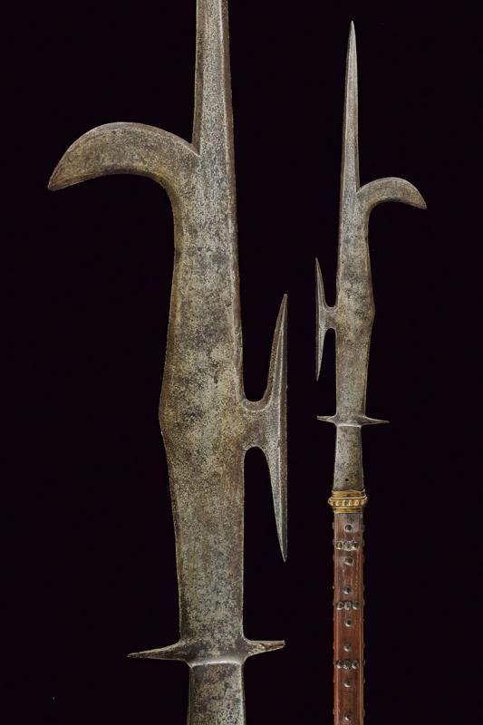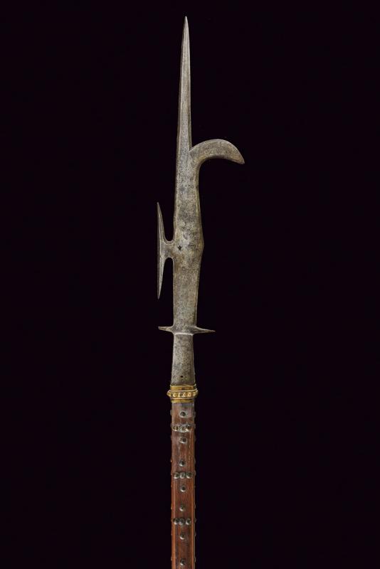 Roncone, datazione: 1500 circa provenienza: Italia, Ferro con cuspide a lama di sezione esagonale, ronca a doppio taglio; arresto dorsale perpendicolare, due arresti alla base, su un lato una profonda marca; gorbia di sezione rettangolare, basata su una ghiera in bronzo con anello perlinato al centro (probabilmente non pertinente), senza bandelle; asta lignea moderna decorato con rivetti metallici. Raro. Vedi due esemplari simile in 'Le Armi Odescalchi' di Nolfo di Carpegna, no. 370/371. altezza 144.5 cm.