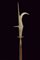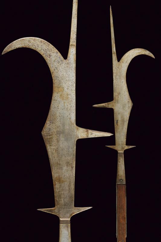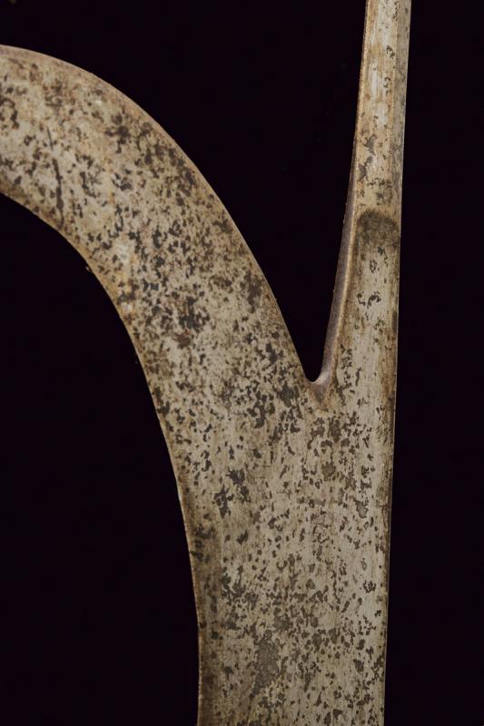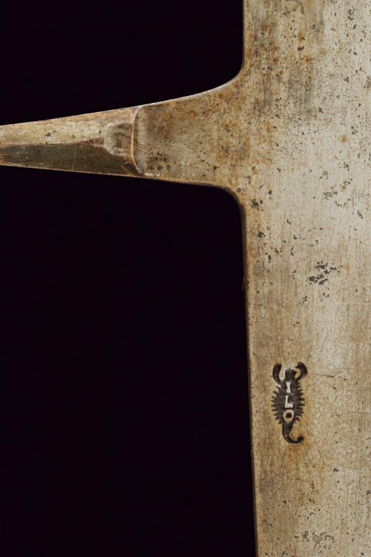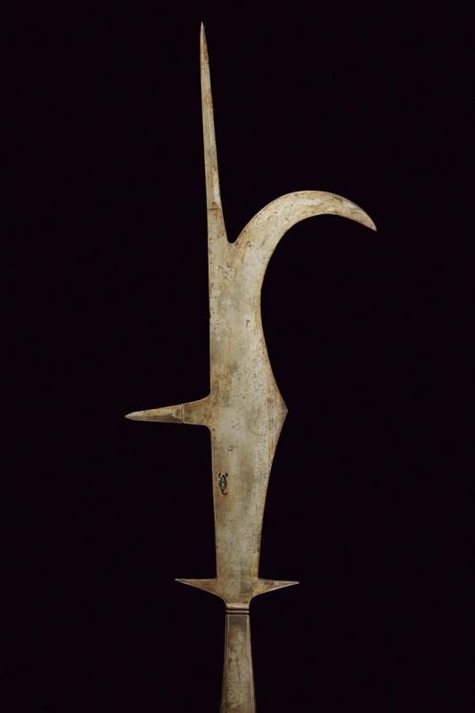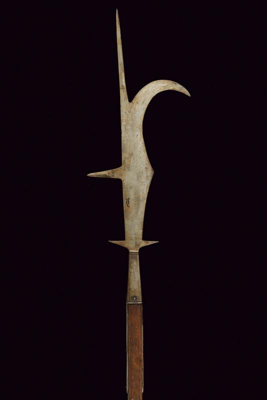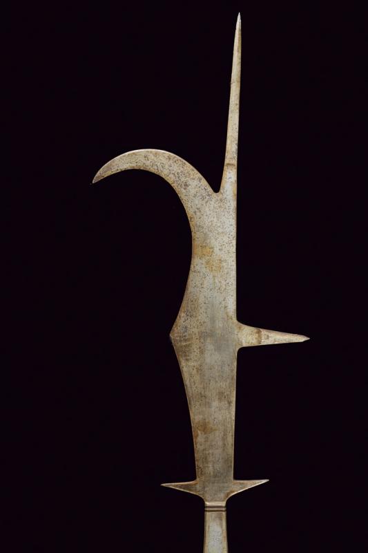 Raro roncone, datazione: inizio del XVI Sec. provenienza: Milano, Cuspide di sezione a losanga, ronca a taglio interno; arresto dorsale perpendicolare rinforzato e costolato nella parte superiore (en suite con la cuspide), su un lato bella e profonda marca di scorpione recante il monogramma del maestro 'ILO', due arresti alla base; gorbia di sezione rettangolare con angoli smussati, crescente verso il fusto. Bandelle piatte. Asta lignea moderna. Molto raro. altezza 235 cm.