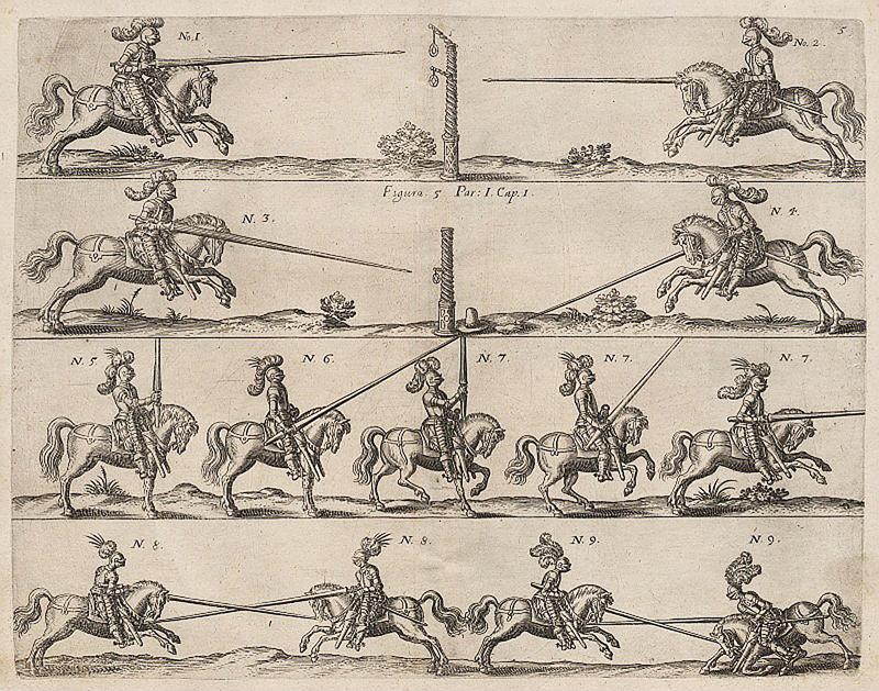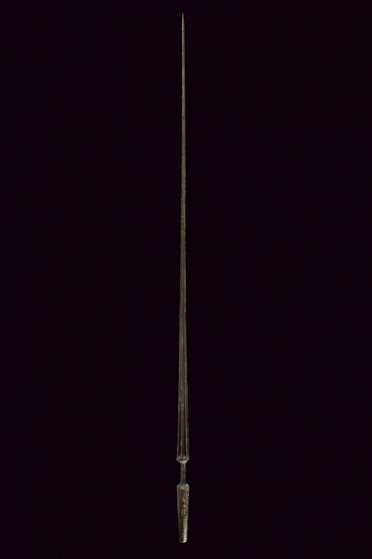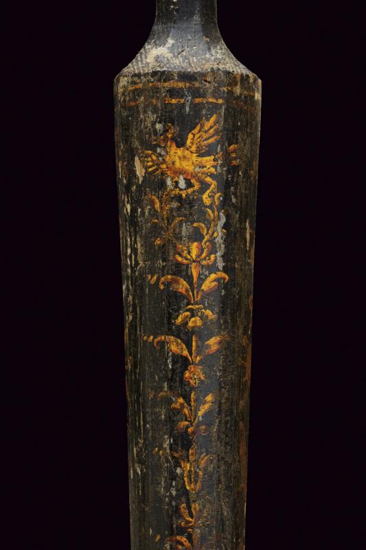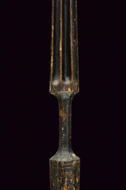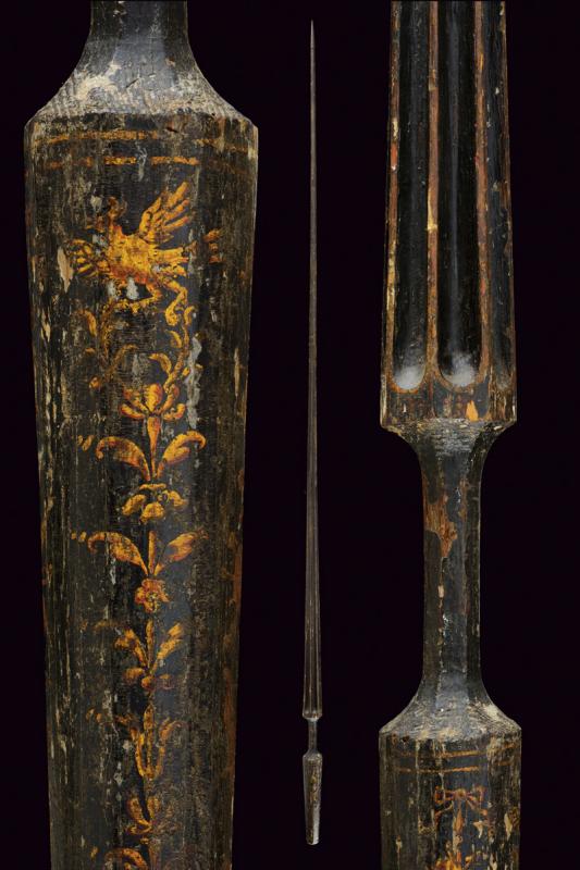 Lancia da Quintana (gioco), datazione: XVII Secolo provenienza: Italia, Leggera lancia in legno con sottile punta in ferro, laccato di nero (mancanze), la prima parte troncoconica, liscia e dipinta in oro a trofei, volatile e motivi floreali (mancanze), dopo un segmento ridotto, diventa cilindrica per la presa e con scanalature longitudinali, diminuendo di ampiezza verso la punta, anche qui resti di pittura in oro. La quintana ha origini romane, ed era soprattutto usato per esercitazioni militari. Nel XVII secolo vennero introdotti tre varianti tra quali la giostra dell'anello per quale si usava questo tipo di lancia e la vittoria andava al cavaliere che aveva staccato più anelli.Vedi un'esemplare molto simile nel museo Odescalchi a Roma. altezza 268.5 cm.