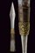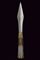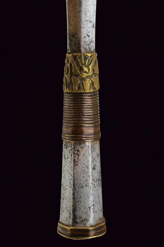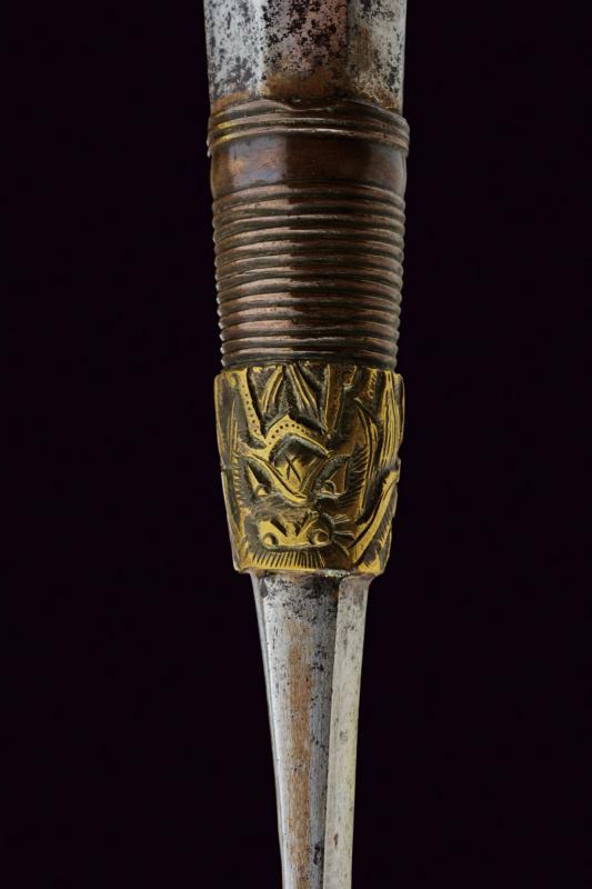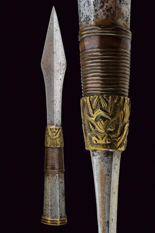 Rara punta di lancia, datazione: 1600 circa provenienza: Cina, Cuspide a lancetta costolata in mezzeria. la base con anello in bronzo inciso, su un lato si vede un mascherone. La parte sotto con rivestimento in rame decorato ad anelli. Gorbia faccettata, la base con anello in bronzo. Laterale foro per il fissaggio ad un asta. altezza 24 cm.