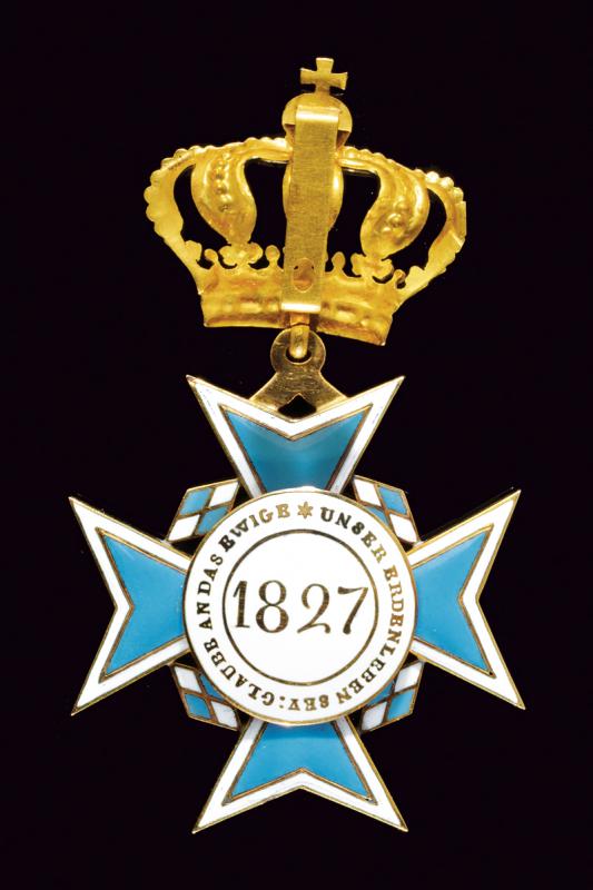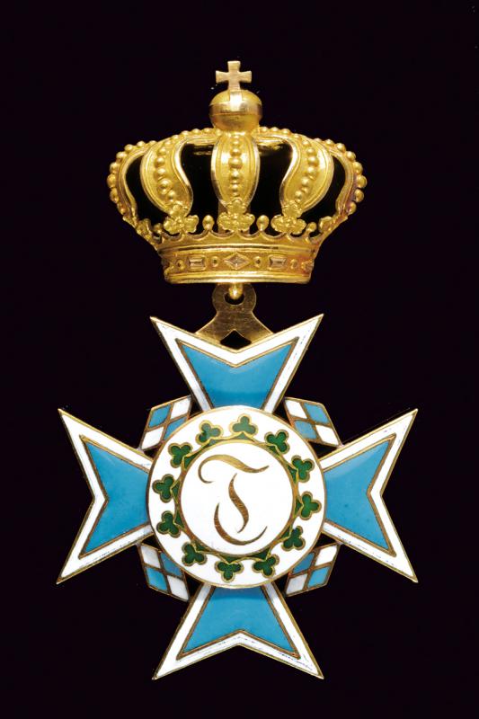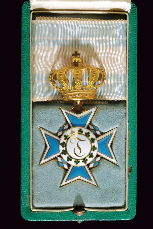 Theresienorden, datazione: XIX/XX secolo provenienza: Baviera, Croce dorata e smaltata con corona e nastro, in astuccio probabilmente non pertinente. dimensioni 4.1 x 4.1 cm.