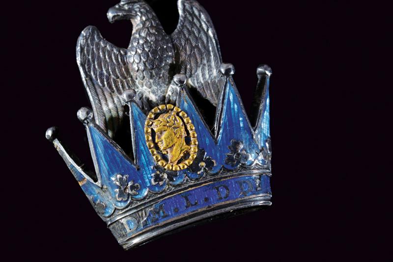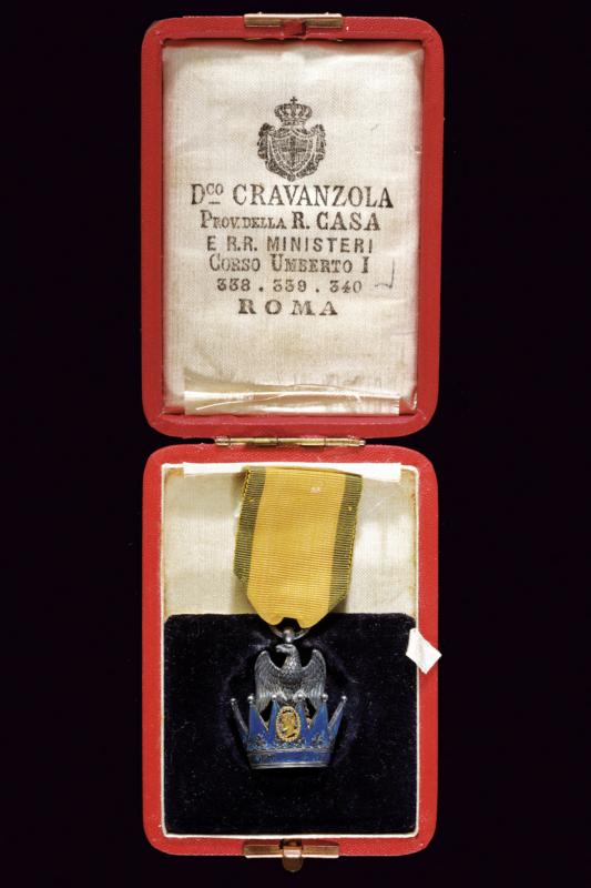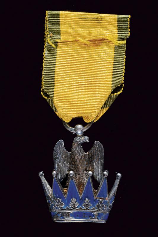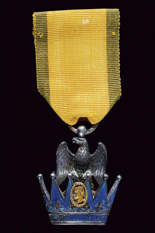 Ordine della Corona di Ferro (italico), datazione: Prima metà del XIX Secolo provenienza: Regno Italico, Croce di cavaliere in argento e smalti blu (alcuni chip soprattutto nel bandeau posteriore). Su nastro. In astuccio non pertinente. dimensioni 2.6 x 2.8 cm.