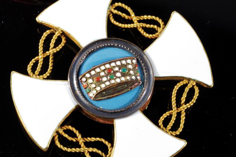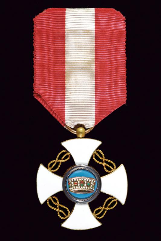 Ordine della Corona d'Italia, datazione: XIX Secolo provenienza: Regno d'Italia, Croce di cavaliere in argento dorato e smaltato (di vecchia forma in smalti celesti). Con nastro. dimensioni 3.5 x 3.5 cm.