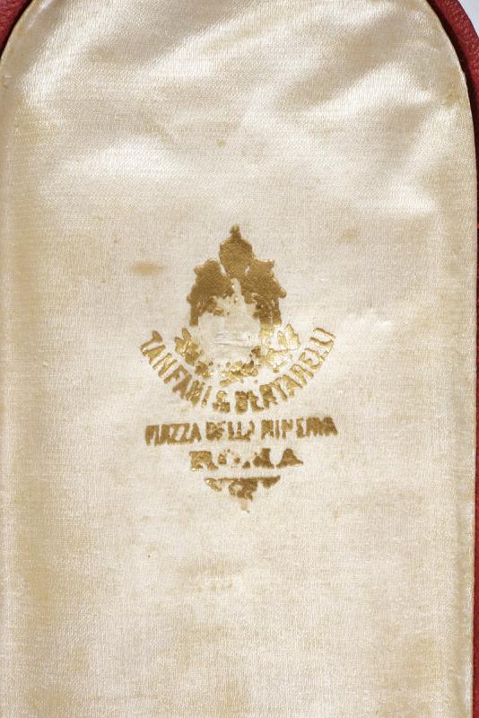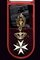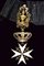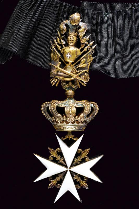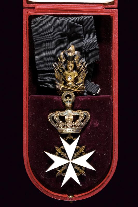 Sovrano Militare Ordine di Malta, datazione: 1900 circa provenienza: Malta, Insegna da collo in argento dorato e smaltato (due piccoli chip). Completo con trofeo sempre in argento dorato con marca 'TANFANI & BERTARELLI ROMA', con nastro nero. In astuccio originale. dimensioni 4.7 x 4.7 cm.
