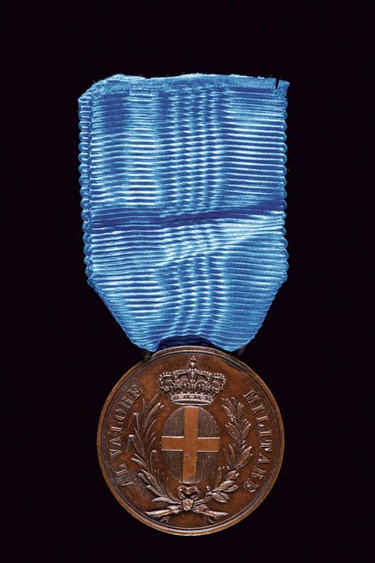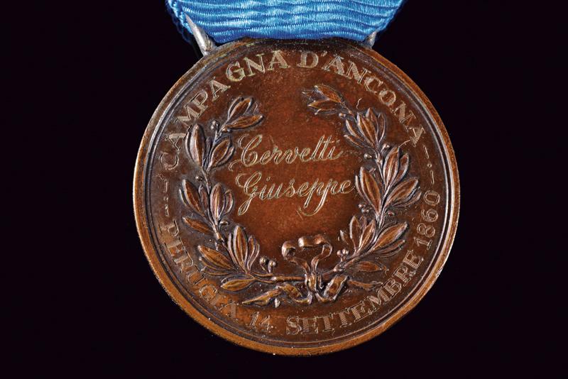 Medaglia al Valore Militare in bronzo, datazione: 1860 provenienza: Regno di Sardegna, Iscrizione 'CAMPAGNA D'ANCONA - PERUGIA 14 SETTEMBRE 1860 / Cervetti Giuseppe'. Su nastro. In astuccio. diametro 3.4 cm.