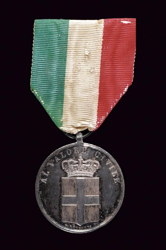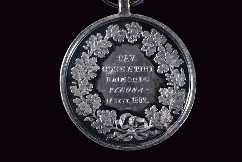 Medaglia al Valore Civile in argento, datazione: 1882 provenienza: Regno d'Italia, Iscrizione 'CAC COSENTINI RAIMONDO - VERONA - 17. SETT 1882'. Marcato 'G. FERRARIS F.'. Su nastro molto usato e con gancio. diametro 3.3 cm.