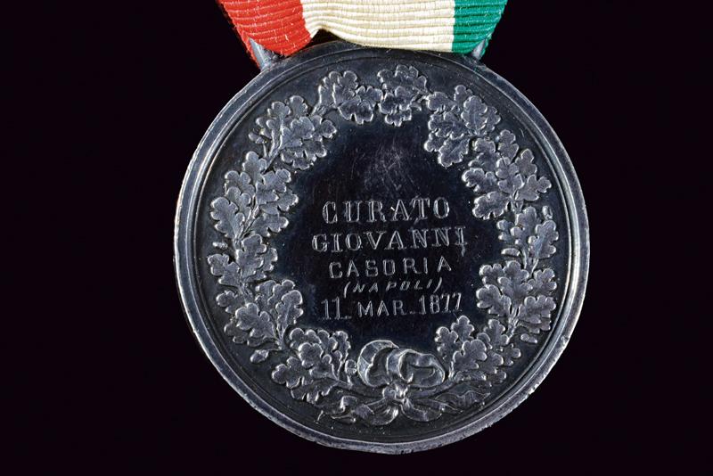 Medaglia al Valore Civile in argento, datazione: 1877 provenienza: Regno d'Italia, Iscrizione 'GURATO GIOVANNI CASORIA (NAPOLI) 11 MAR. 1822'. Marcato 'G. FERRARIS F.'. Su nastro. diametro 3.3 cm.