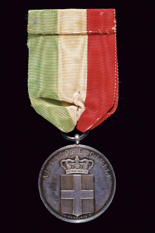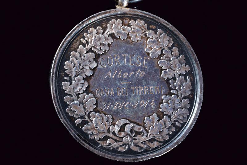 Medaglia al Valore Civile in argento, datazione: 1914 provenienza: Regno d'Italia, Iscrizione 'CORTESE Alberto CAVA DEI TIRRENI 31.DCI.1914'. Marcato 'G. FERRARIS F.'. Su nastro. diametro 3.3 cm.