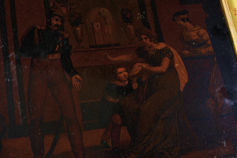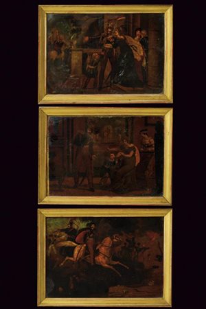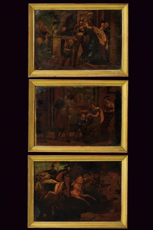 Lotto di tre dipinti su vetro, datazione: XIX Secolo provenienza: Francia, Raffigurante scene dell'epoca napoleonica, due con addio del padre, ufficiale della guardia polacca dei lancieri, dalla sua famiglia, il terzo con cavalleria napoleonica in combattimento. La pittura effettuata dietro vetro. In cornici coeve dorate. dimensioni 28.5 x 19.5 cm.
