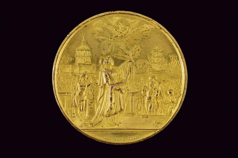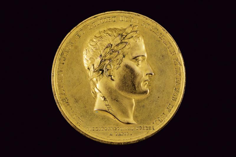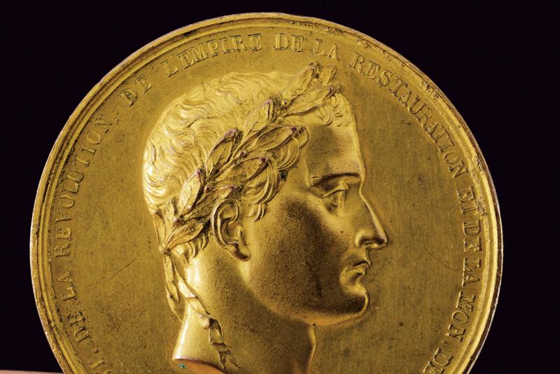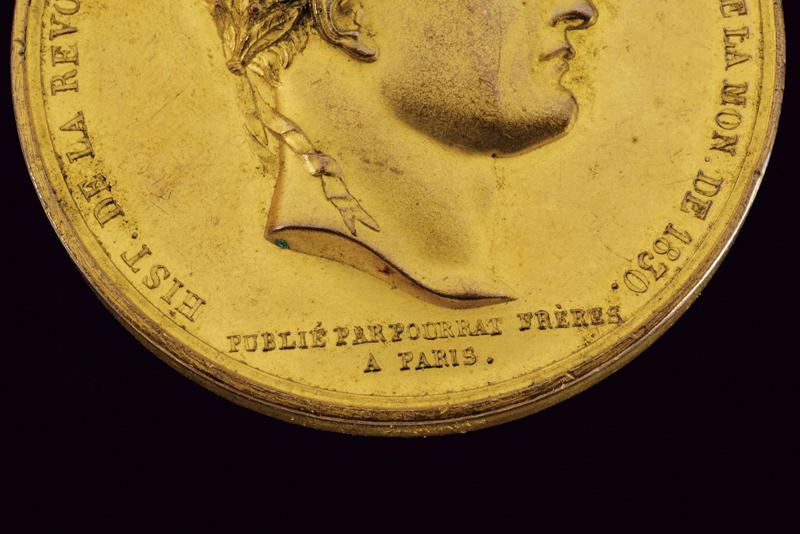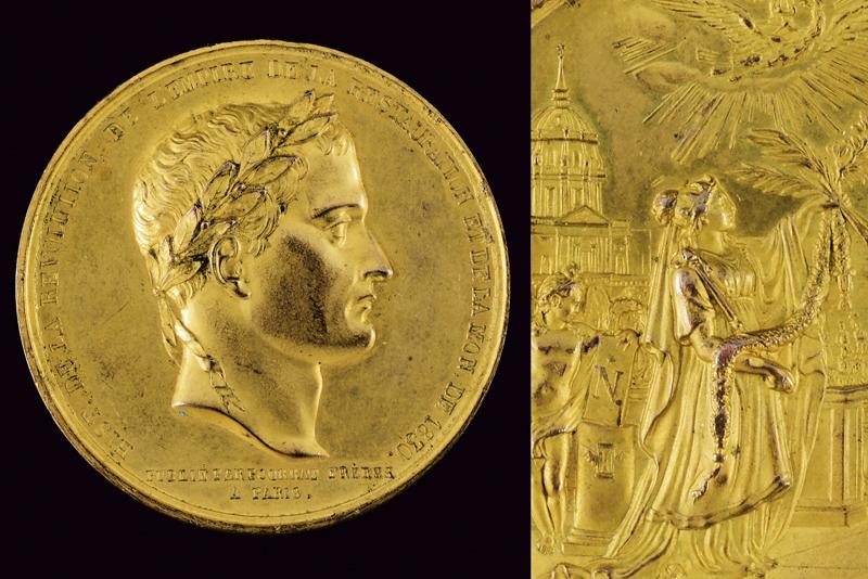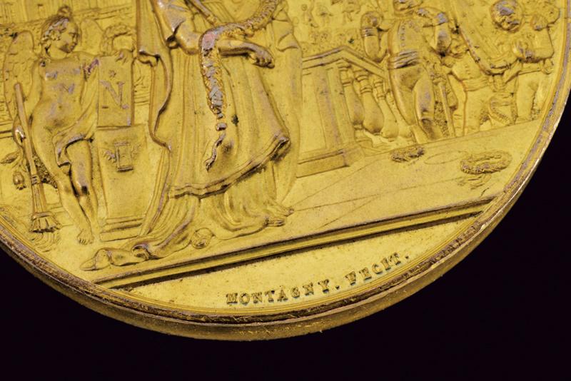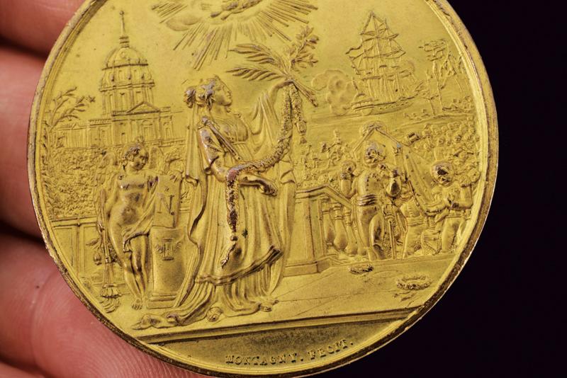 Napoleone I all'Hotel des Invalides, datazione: XIX Secolo provenienza: Francia, Medaglia commemorativa per l'arrivo delle spoglie di Napoleone I all'Hotel des Invalides. Al recto: ritratto di Napoleone in rilievo con corona di foglie di lauro al bordo l'iscrizione 'HIST. DE LA REVOLUTION, DE L'EMPIRE DE LA RESTAURATION ET DE LA MON. DE 1830'. In basso: 'PUBLIE PAR POURRAT FRERES / A PARIS'. Al verso bella raffigurazione in bassorilievo dell'arrivo della bara di Napoleone, con effige della Francia personificata, in basso la firma 'MONTAGNY FECIT'. Copia antica. Il bordo marcato 'CUIVRE'. In metallo dorato. diametro 5.3 cm.