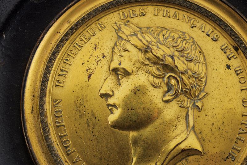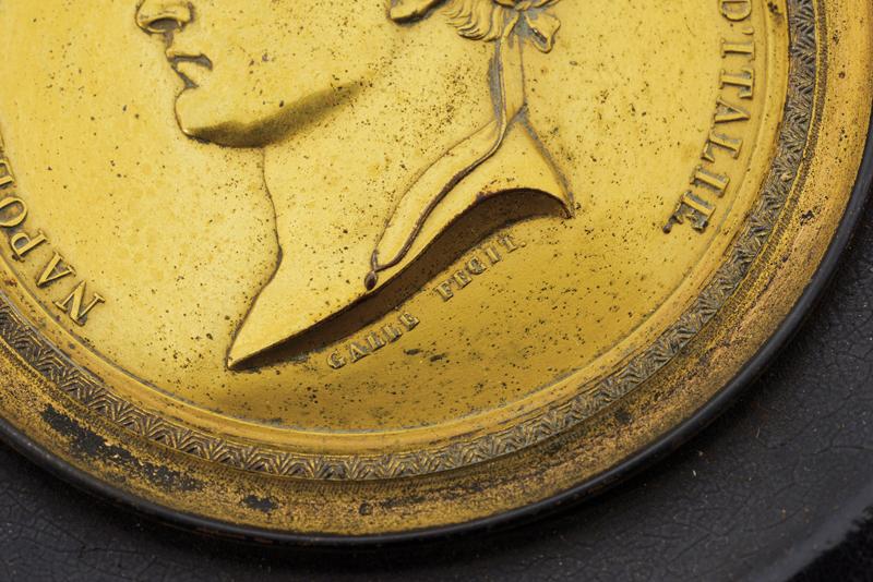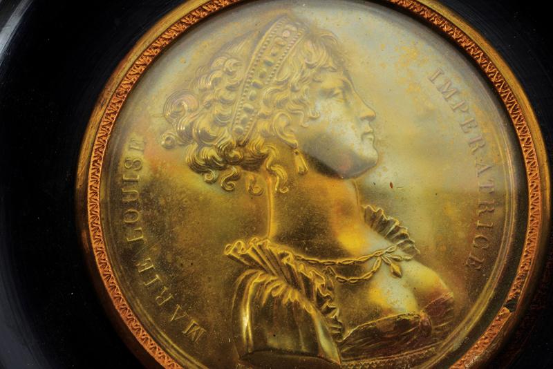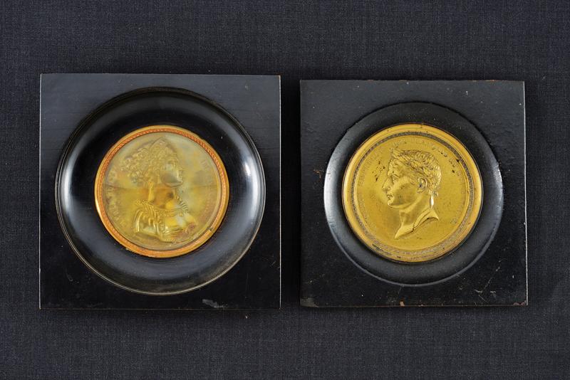 Napoleone I e Maria Luisa d'Austria, datazione: XIX Secolo provenienza: Francia, Due medaglioni in bronzo raffigurante dorato con il profilo di Napoleone e di Maria Luisa d'Austria in altorilievo. In cornici nere di diverso tipo. dimensioni 7 - 7.5 cm.