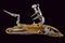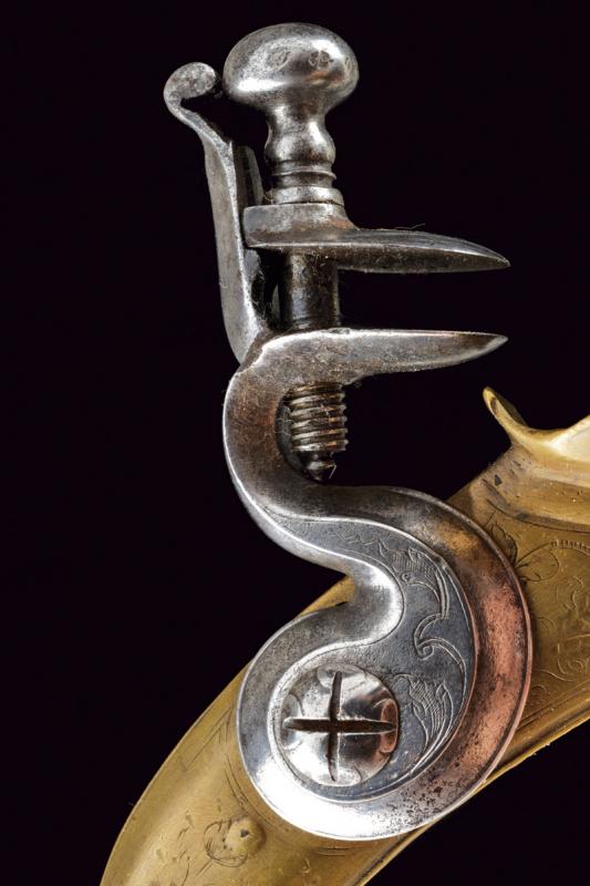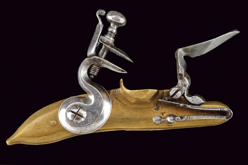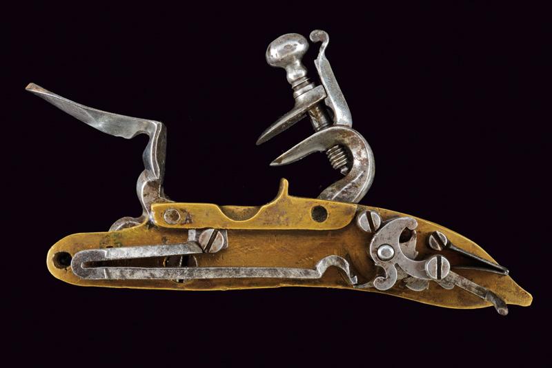 Batteria a pietra alla moderna, datazione: 1800 circa provenienza: Europa, Cartella in bronzo con resti di incisioni floreali. Cane, molla e martellina in ferro, parzialmente incise. Probabilmente per un'arma navale. lunghezza plate 13.4 cm.