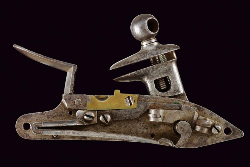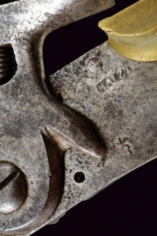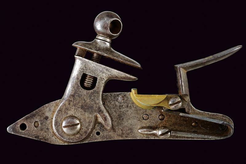 Batteria a pietra militare, datazione: XVIII Secolo provenienza: Spagna, Cartella piatta leggermente incurvata. Al centro tracce di una firma o marcatura 'MAZZ...' o 'MATZ...', più in basso resti di un punzone non chiaramente leggibile. Segni d'uso e del tempo. Scodellino in ottone. lunghezza plate 17,2 cm.