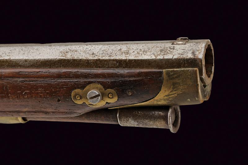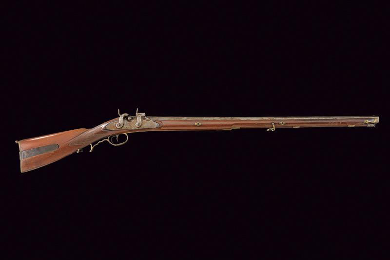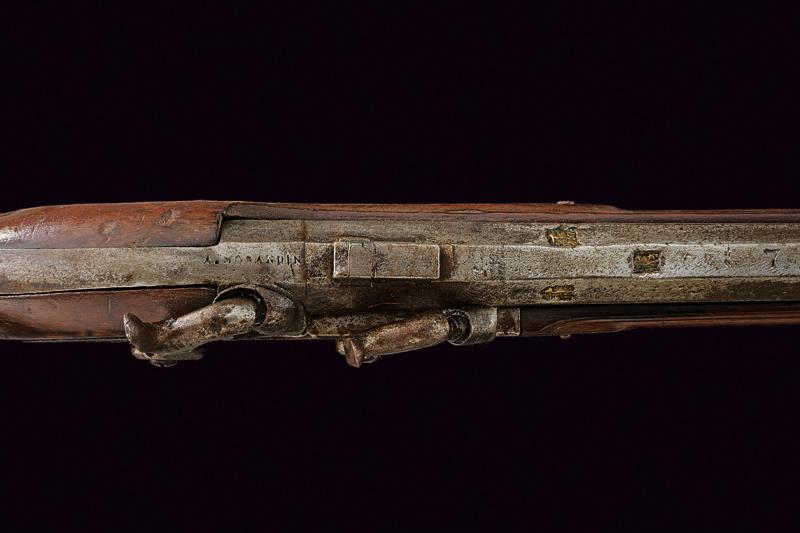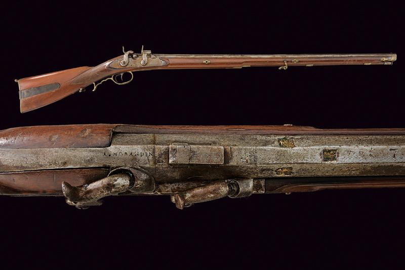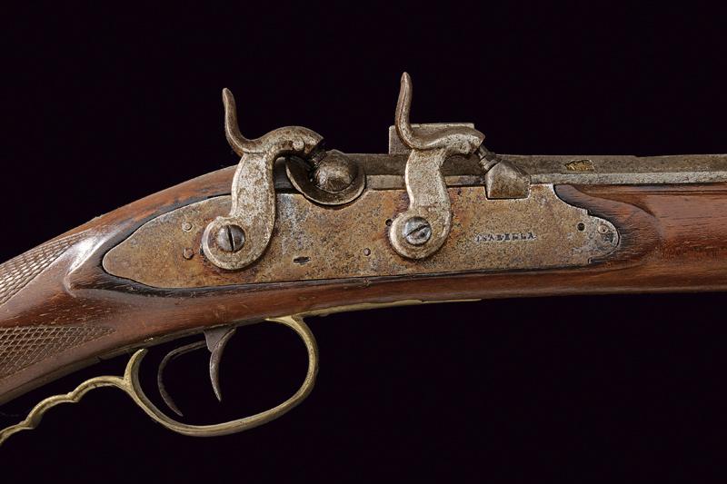 Raro fucile a luminello a cariche sovrapposte, datazione: Metà del XIX Secolo provenienza: Spagna, Canna rigata, ottagonale, di epoca antecedente, marcato alla base 'A. MORANDIN', dopo un traguardo rettangolare tre marchi poco visibili e la data '1738' (il primo numero poco visibile), mirino, cal. 14 mm; lunga batteria a cartella piatta firmata 'ISABELLA' e con un punzone, munito di due cani a luminello. Cassa intera in legno con collo zigrinato e fornimenti in ottone. Patchbox. Bacchetta in legno con battipalla in ferro. lunghezza 130.5 cm.