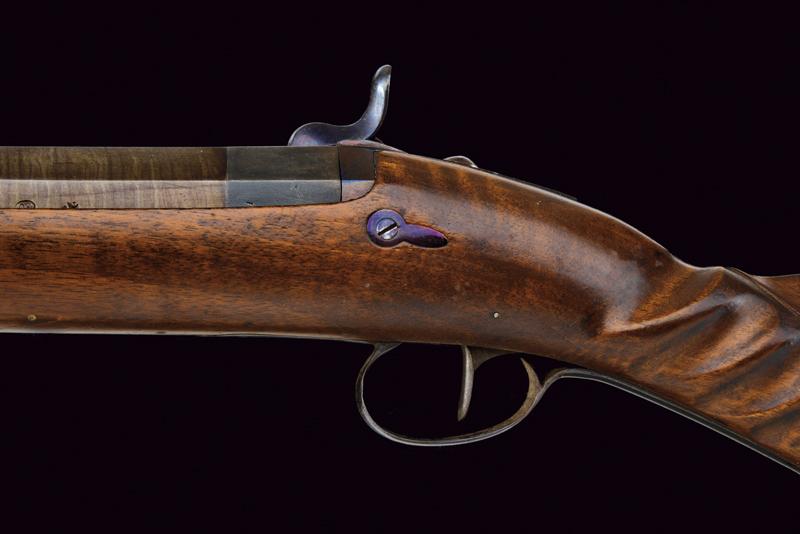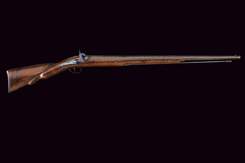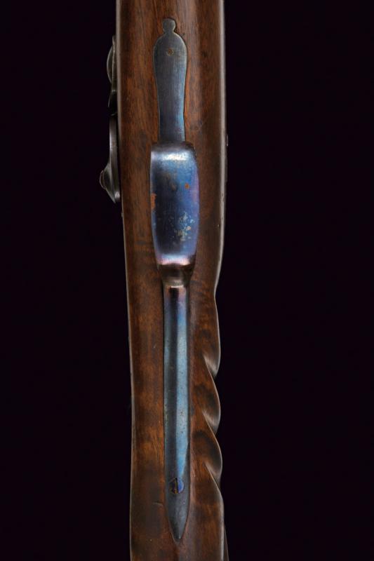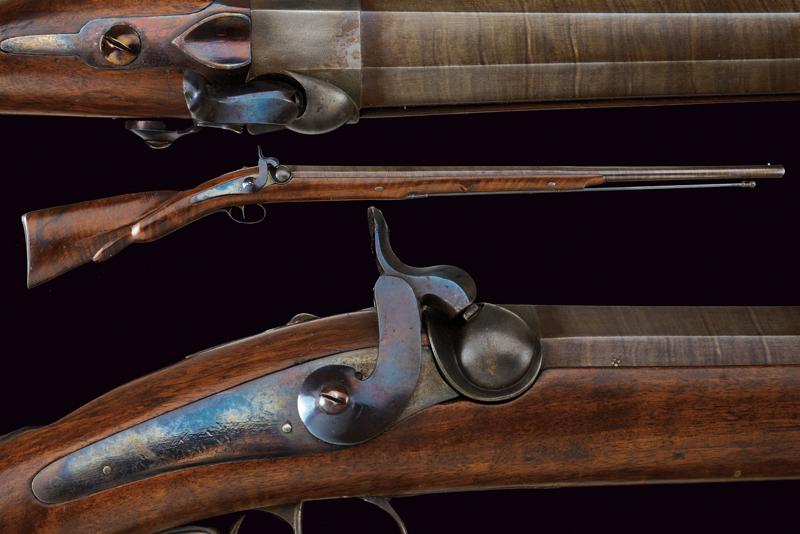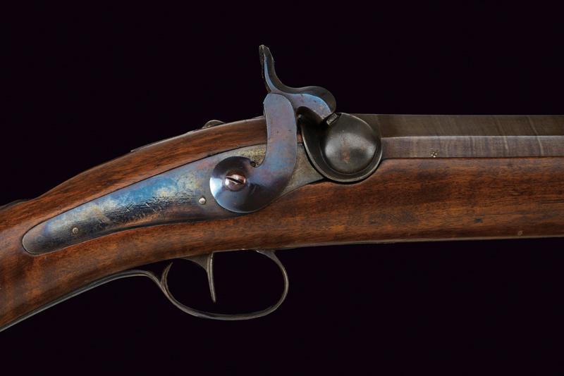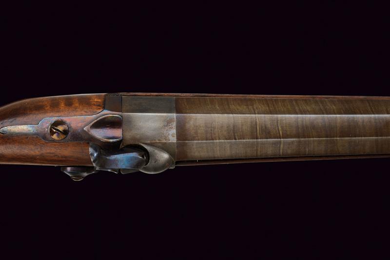 Spingarda a luminello, datazione: Metà del XIX Secolo provenienza: Inghilterra, Pesante canna liscia a due ordini che passa da ottagonale senza cambio in tonda, a torcione, due punzoni laterali, uno del banco di prova, mirino, cal. 19 mm; codetta con traguardo. Grande batteria a molla indietro liscia con 70% della brunitura. Cassa a tre quarti in legno con calcio scolpito e lavorato anatomico nella parte sinistra. Fornimenti in ferro brunito en suite. Bacchetta in ferro. Rara. lunghezza 138 cm.