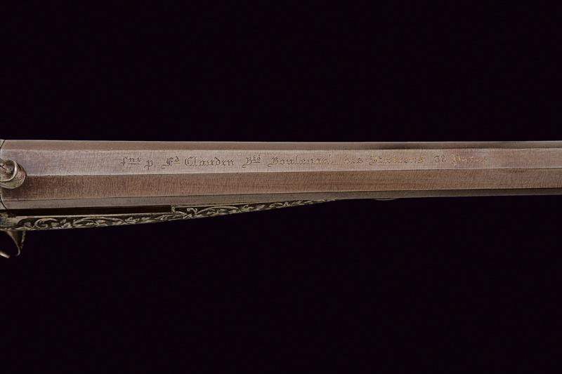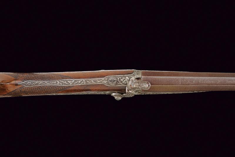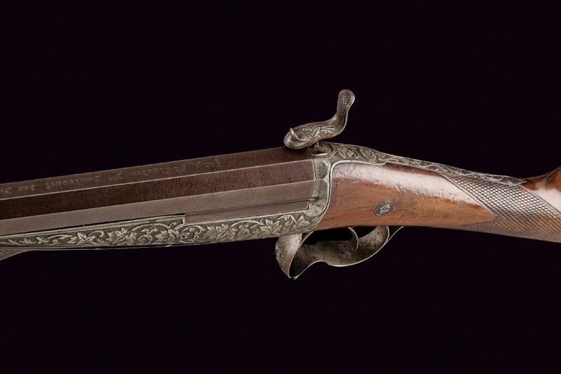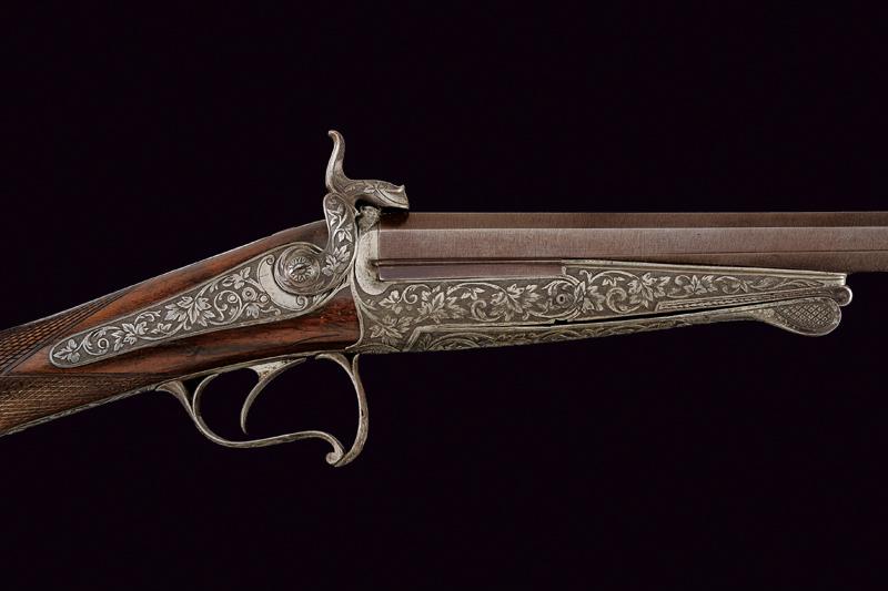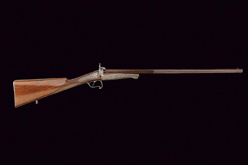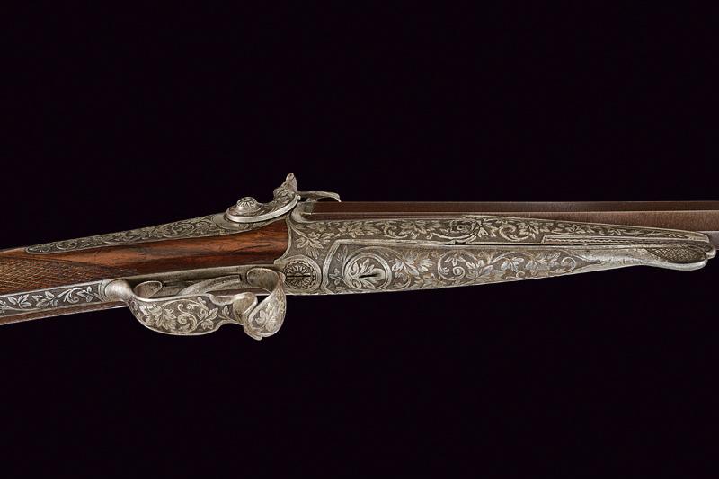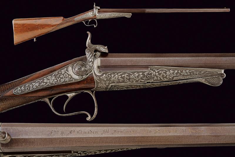 Fucile monocolpo a spillo di Claudin, datazione: Terzo quarto del XIX Secolo provenienza: Francia, Canna liscia a due ordini, ottagonale e tonda, firmata al dorso 'F.ni P. F.a Claudin B.te Boulevard des Italiens 38 Paris', dotata di mirino. Calibro probabilmente 22 gauge. Cal. in volata 15,2 mm. La bascula e la culatta in un unico blocco. Il codolo dorsale con traguardo a sella e intagli a racemi su fondo a granuli. Batteria a molla indietro con fini intagli a tralci di vite su fondo a granuli, il cane intagliato en suite. Meccanica funzionante. La bascula riccamente ornata, recante lo stesso motivo decorativo, come anche la leva e il ponticello. Calcio in radica con collo zigrinato. Calciolo in ferro lavorato en suite. lunghezza 98,7 cm.